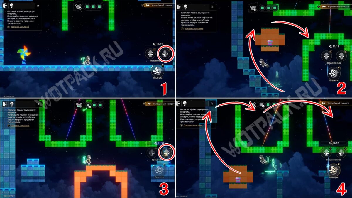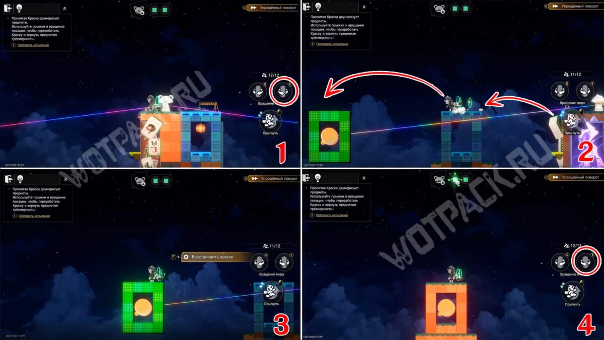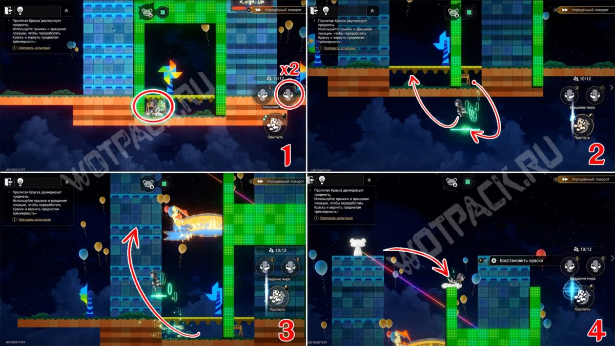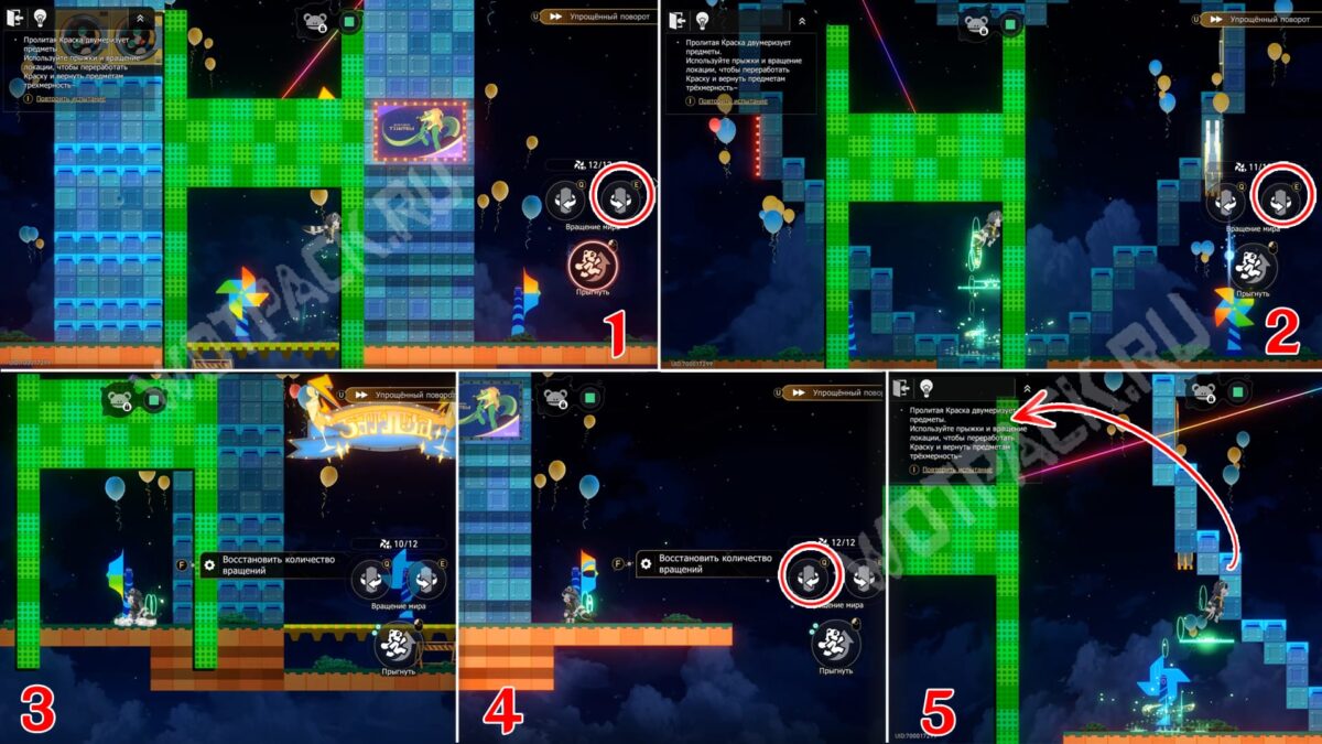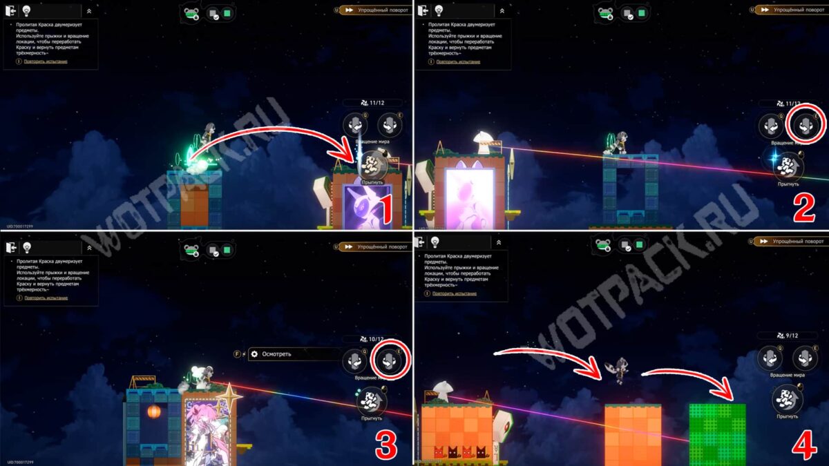 Взберитесь на верх башни и совершите прокрут против часовой стрелки («Е»). Прыгайте к левому объекту и восстановите его цвет, потом ещё раз поверните мир в том же направлении («Е»).