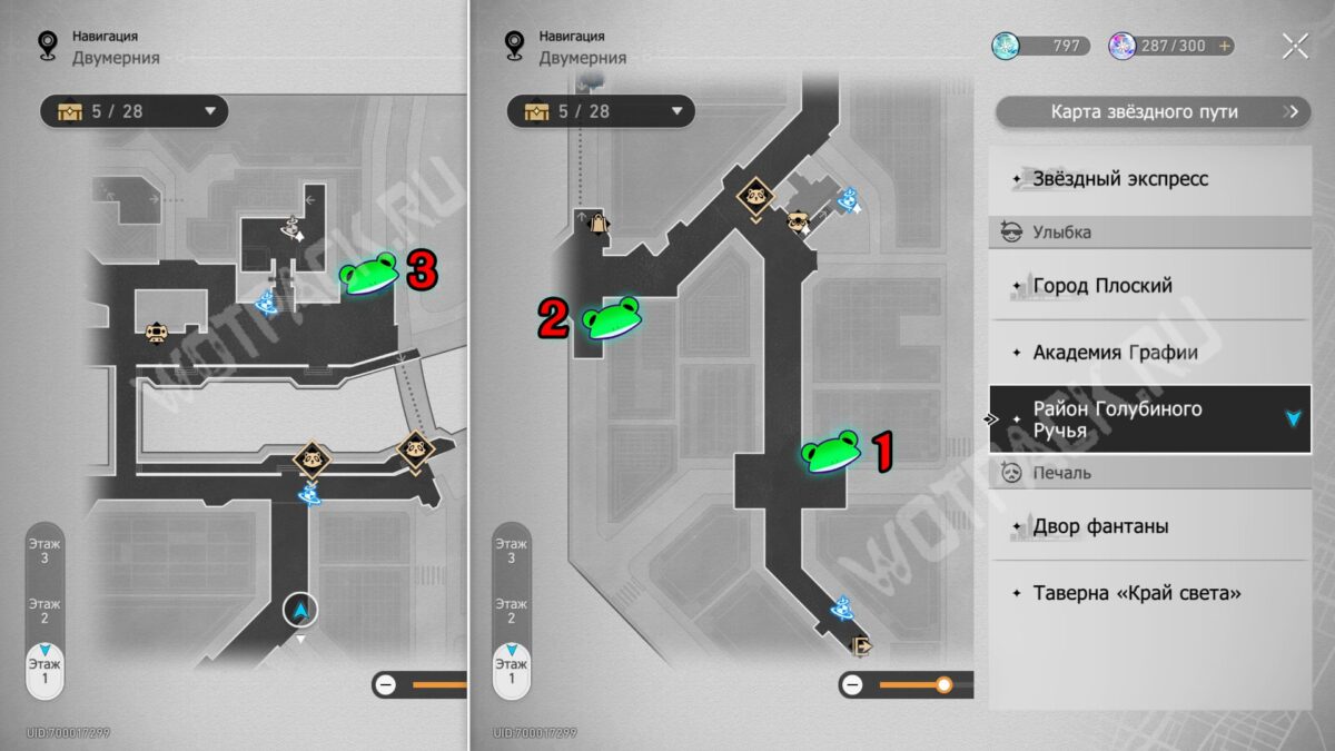 Выполните три испытания «Двухмерный поворот» в Районе Голубиного Ручья и помогите духу зелёной лягушки в Хонкай: Стар Рейл для получения призов: