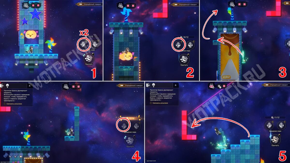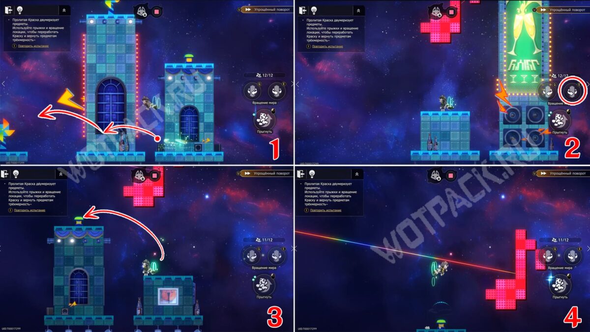 Двигайтесь влево до самой последней платформы, встаньте на её верхушку и один раз прокрутите мир против часовой стрелки («E»). Запрыгните на батут и с него долетите до единственного объекта, который нужно окрасить. Прохождение в формате видео:
