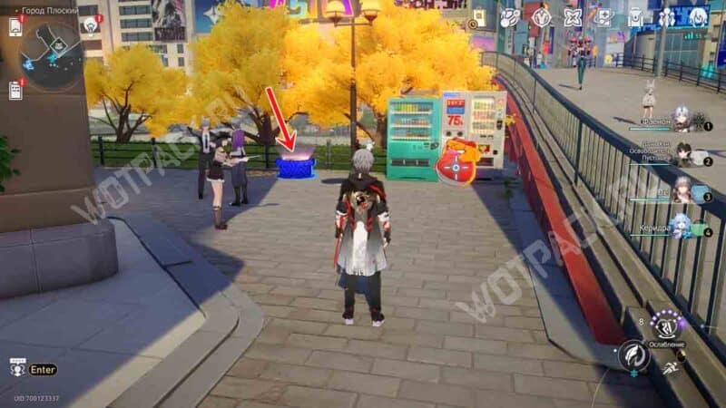 Сверните на восточную тропу с аллеей, выйдя от телепорта «@Вход». Проход в «Двухмерный прыжок» расположился рядом с автоматами с едой.