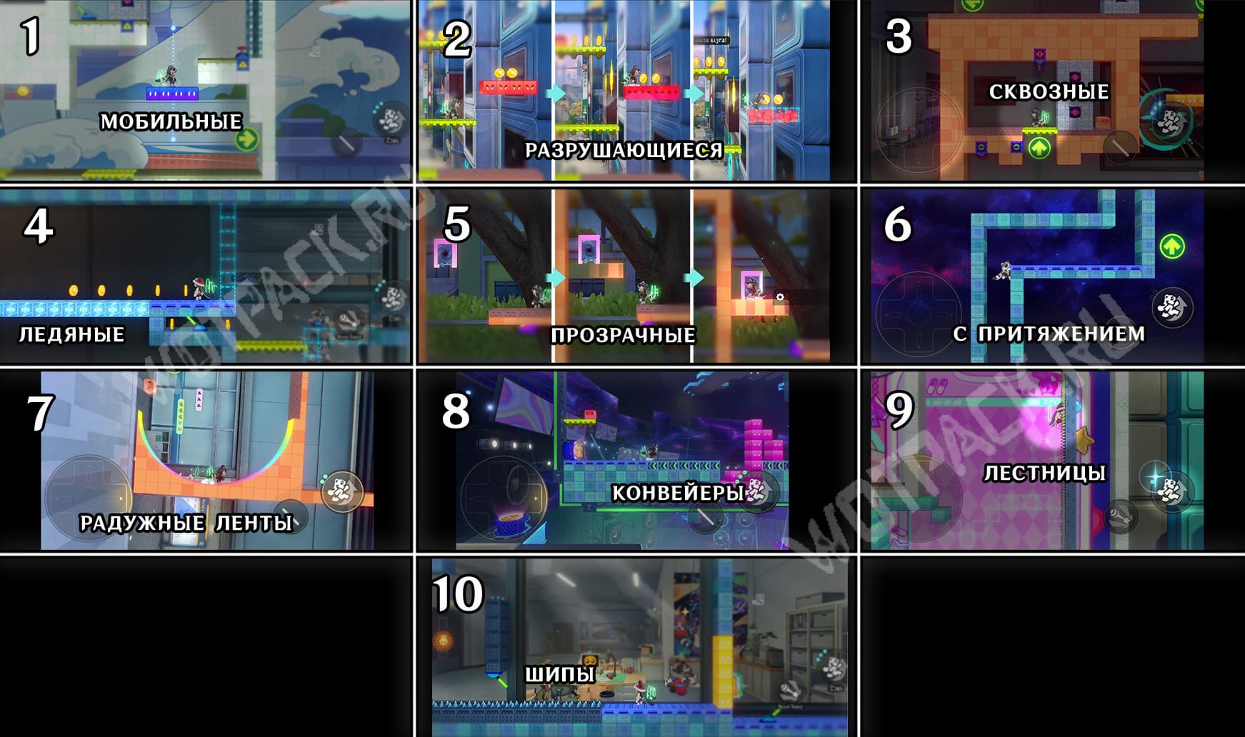 - Голубые ледяные ускоряют персонажа и усложняют его остановку.
