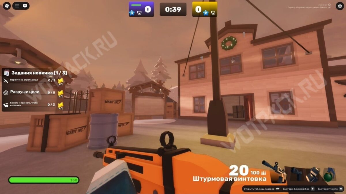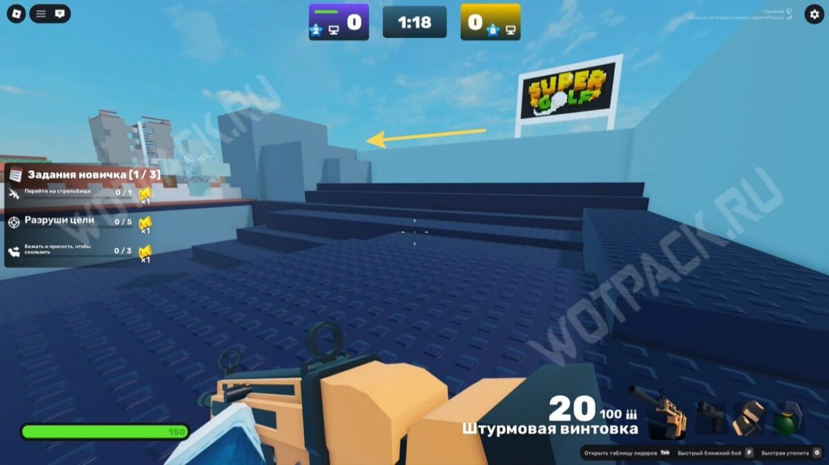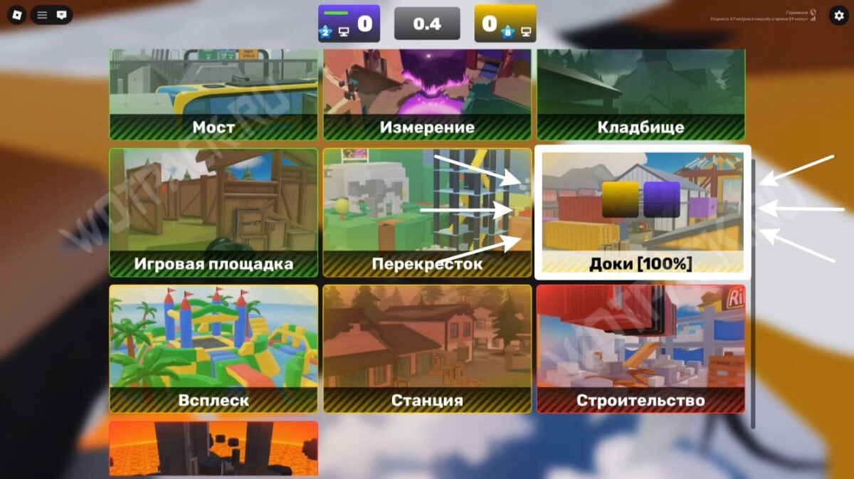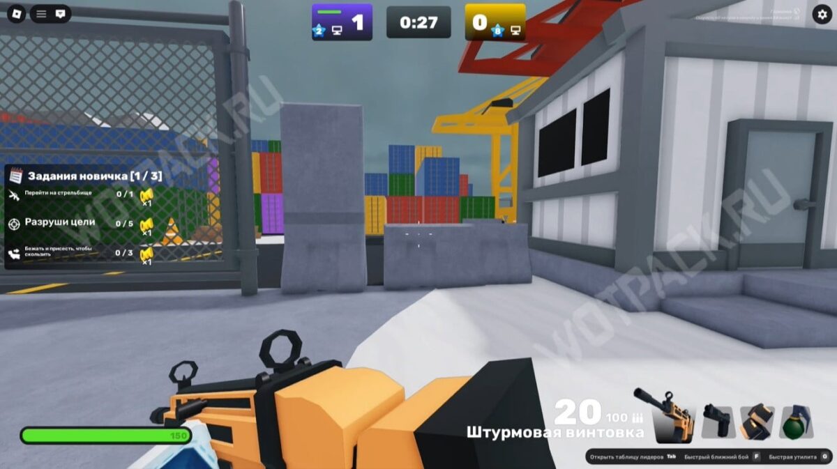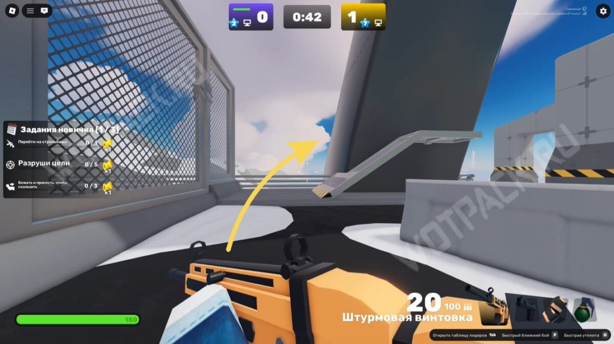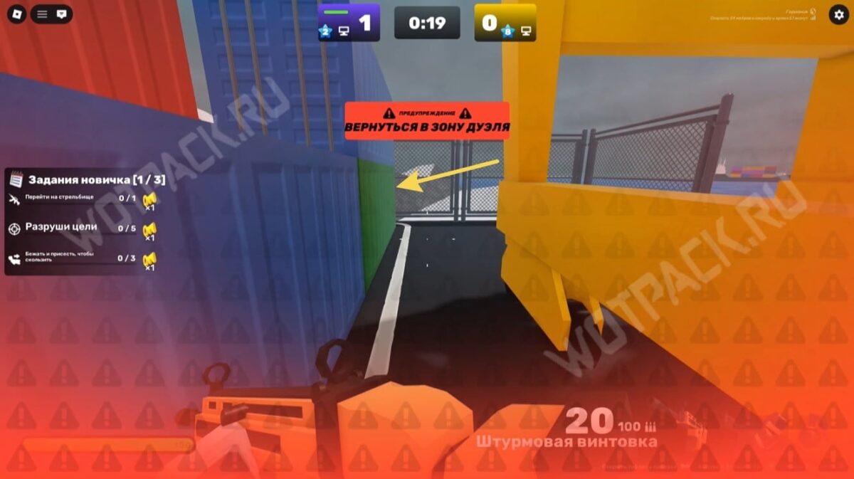 Запустите карту «Доки» (Docks) и подойдите к краю дуэльной зоны (бело-серое здание). Переключите оружие на кулаки и бегите к жёлтому строительному крану.