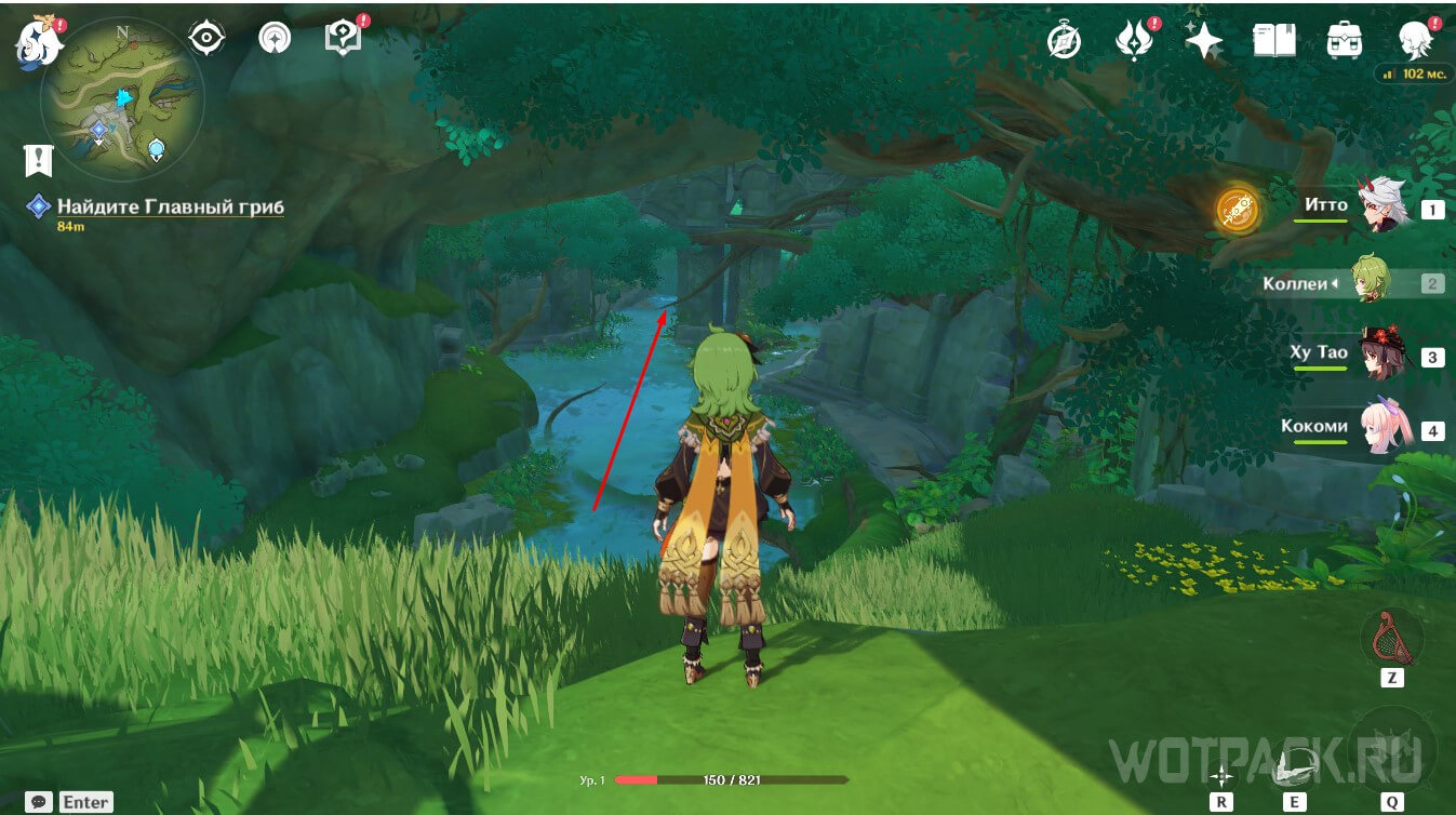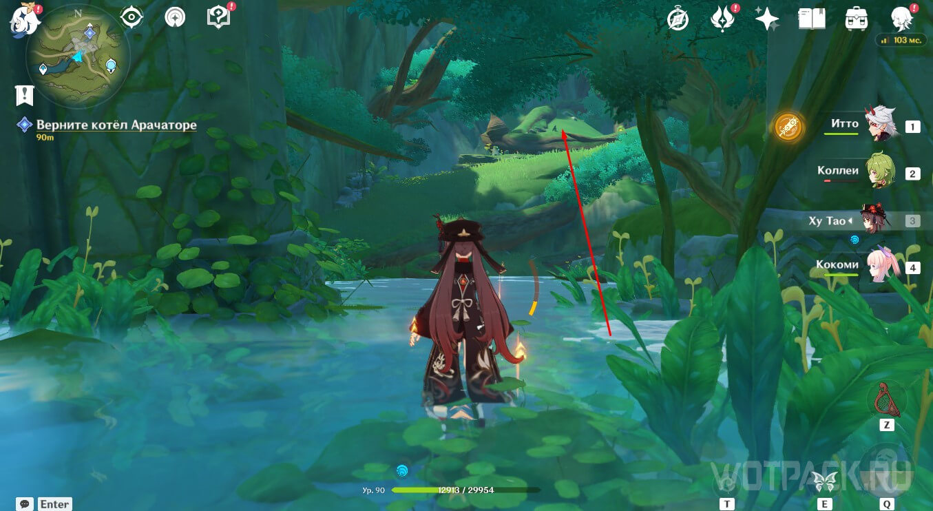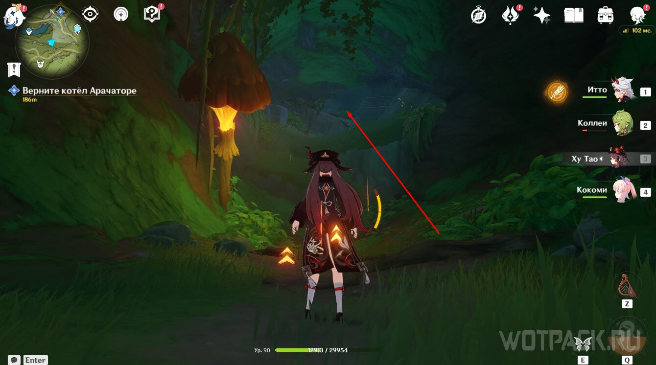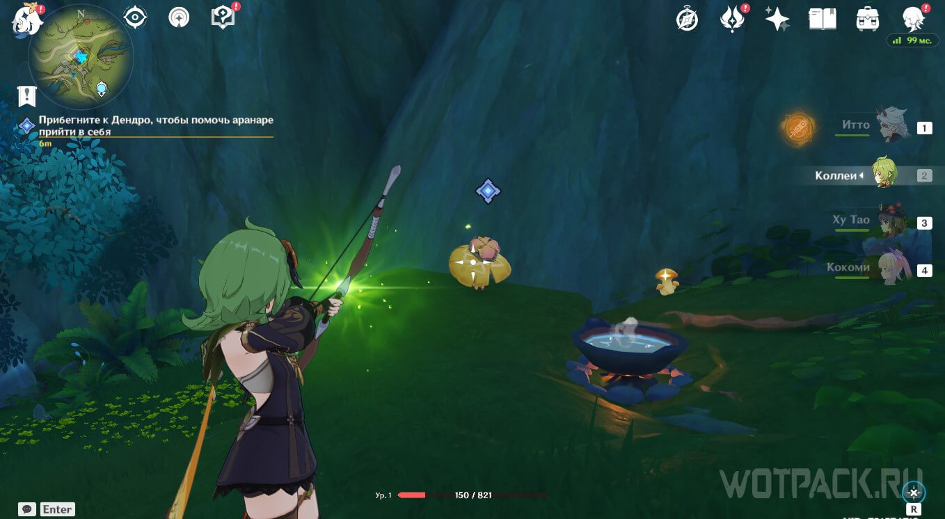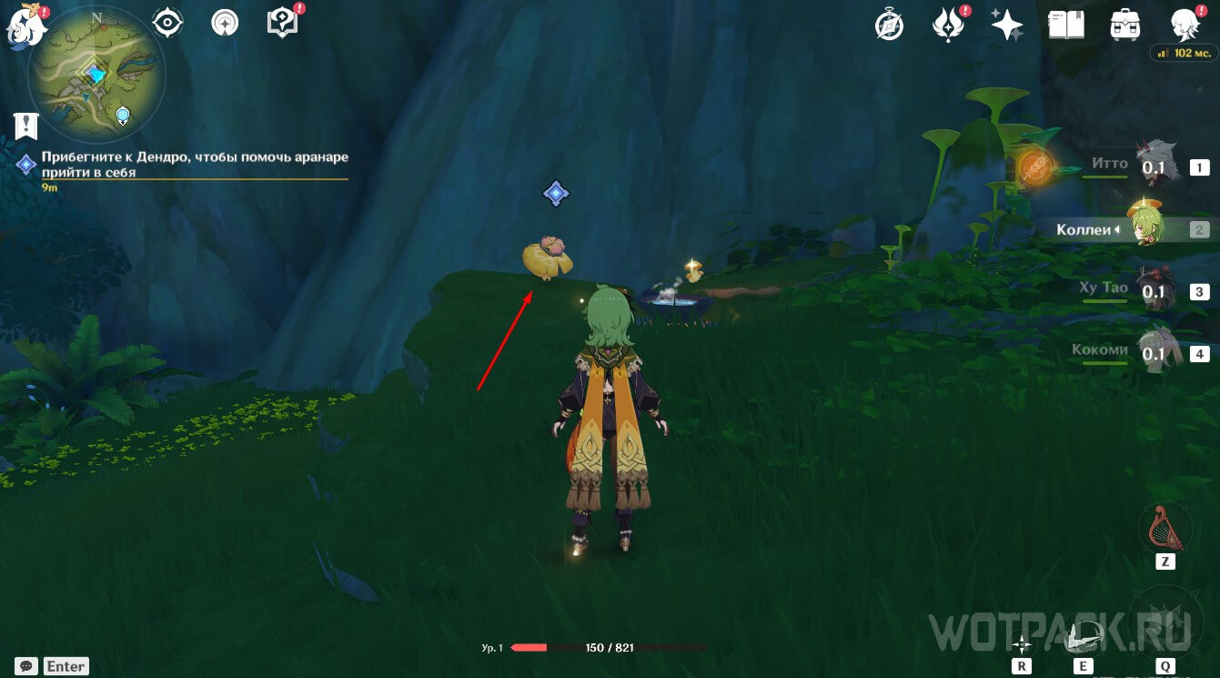 Стоящий в данном месте аранара находится в странном состоянии. Чтобы «разбудить» его необходимо воздействовать на существо элементом Дендро. Это можно сделать при помощи элементальных навыков или заряженных атак лучников, имеющих соответствующий Глаз Бога, или Ешки Дендро Путешественника.