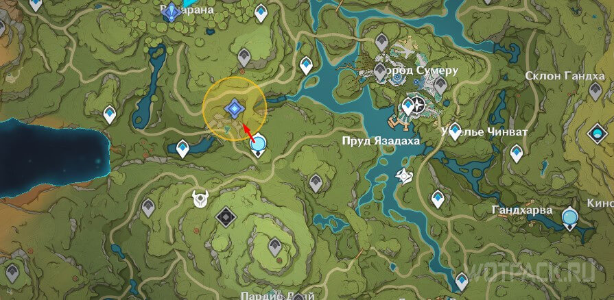 Переместитесь на статую Дендро Архонта в Лесах Вишудхи и пройдите в желтую область на северо-запад.