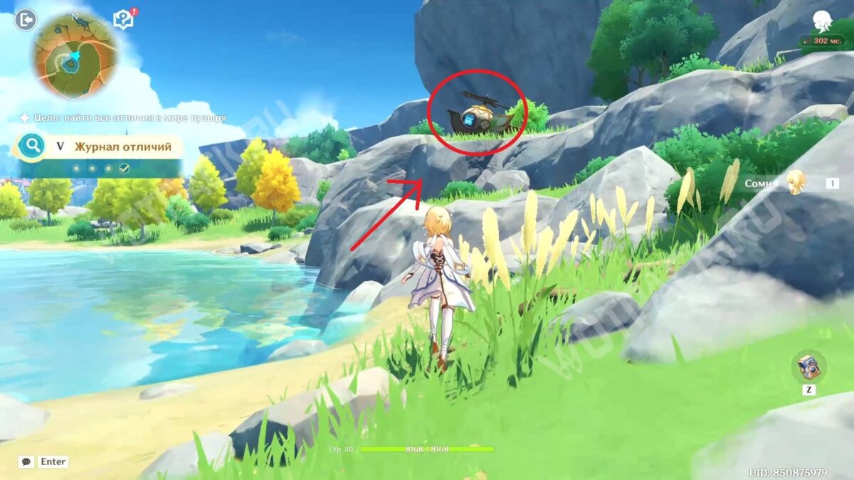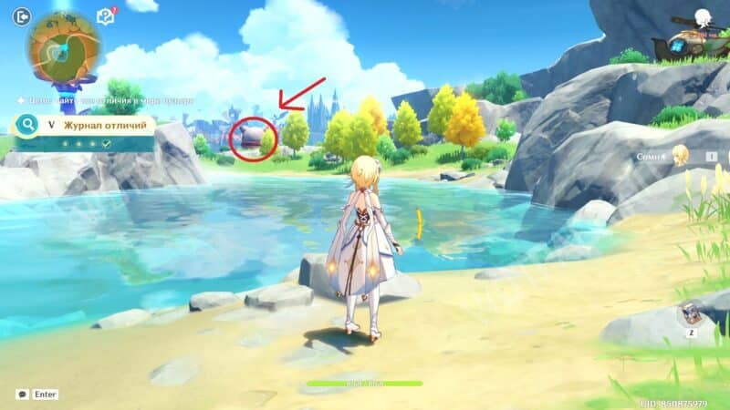 На севере от озера оставлена ещё одна пасхалка с предыдущих летних ивентов. В этот раз — игрушечная лодочка, используемая на аттракционах в Мираже Велуриям. Сфотографируйте её, чтобы закончить задание.