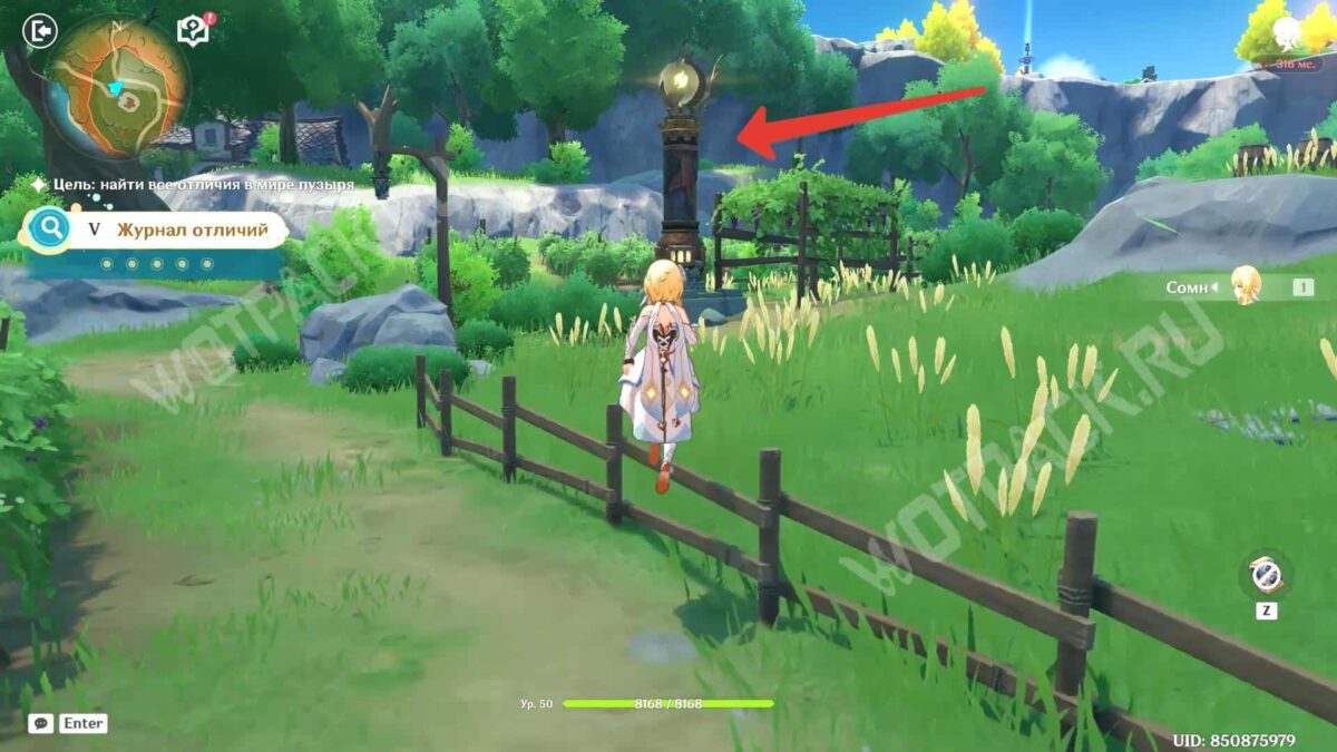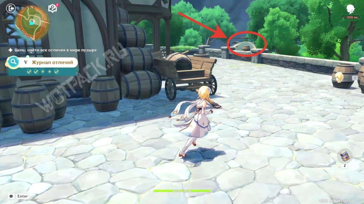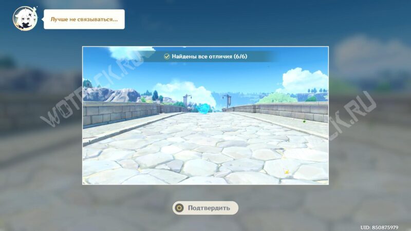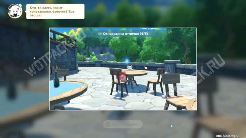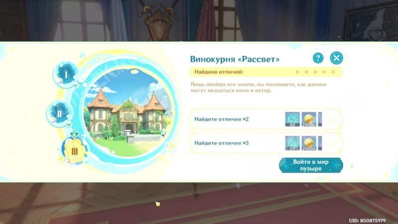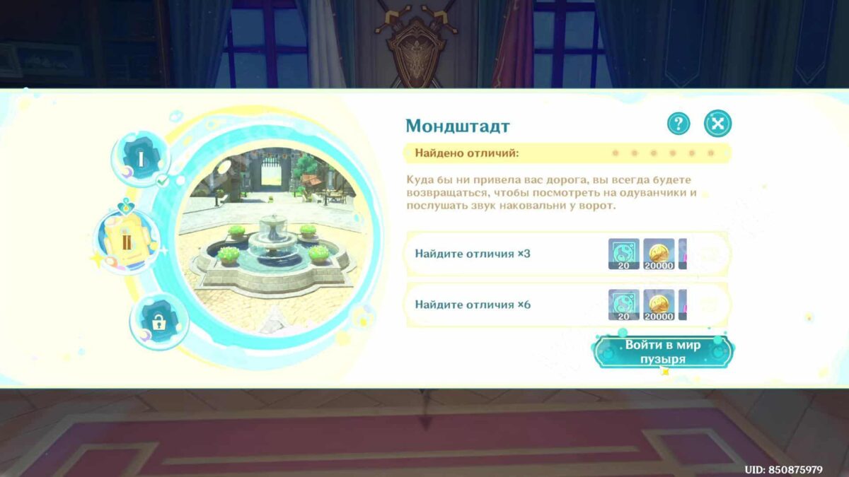 В испытании переместитесь в иную вселенную с помощью волшебного пузыря и исследуйте окрестности Мондштадта, чтобы найти различия с реальным миром. Сфотографируйте аномалии на особую камеру: она включается на «Z» для фиксации проблемных объектов.