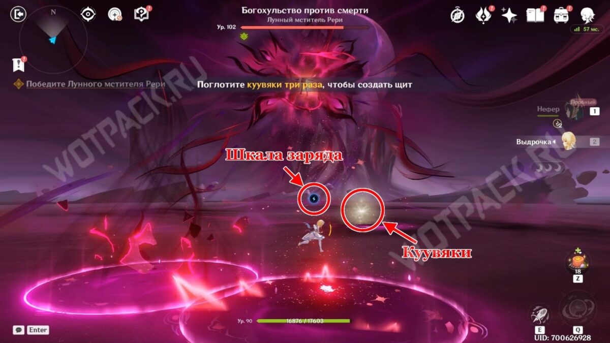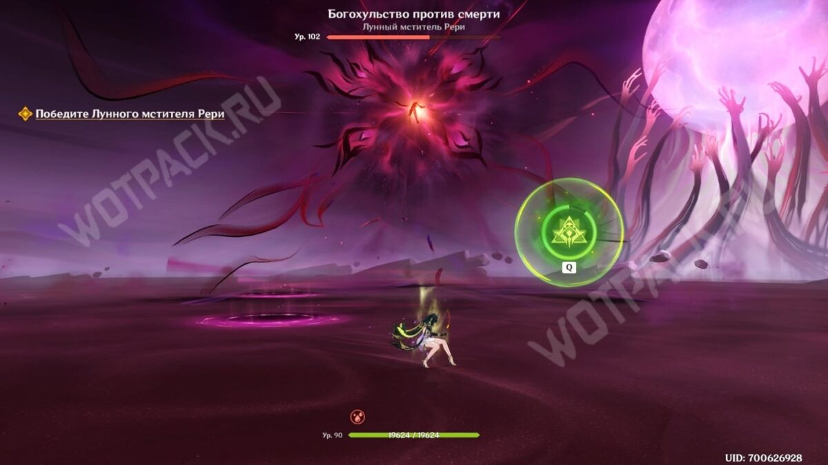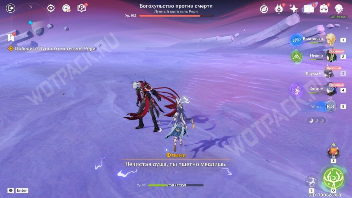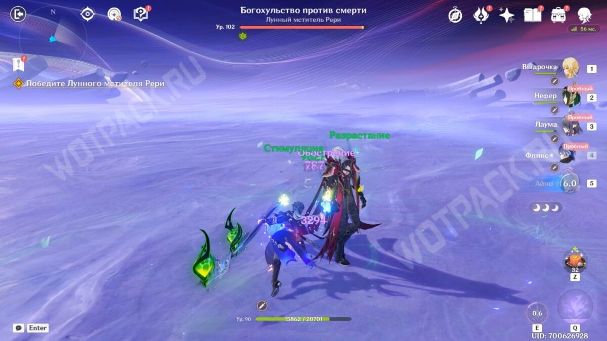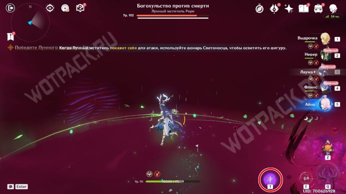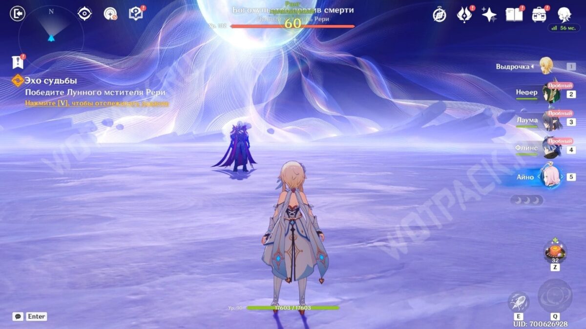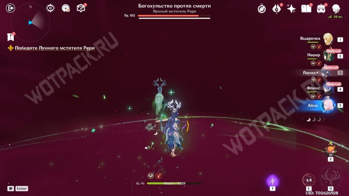 Обсудив действия, дождитесь, пока «Богохульство против смерти» Лунный мститель Рери выберется из шахматной шкатулки. На поле боя окажетесь с отрядом из пяти пробных героев: Нефер, Лаума, Флинс, водный Путешественник и пятый слот займёт Айно, на которую нельзя переключиться. Девочка-изобретатель послужит дополнительной поддержкой и источником Гидро статуса. Её способность можно использовать раз в 20 секунд.