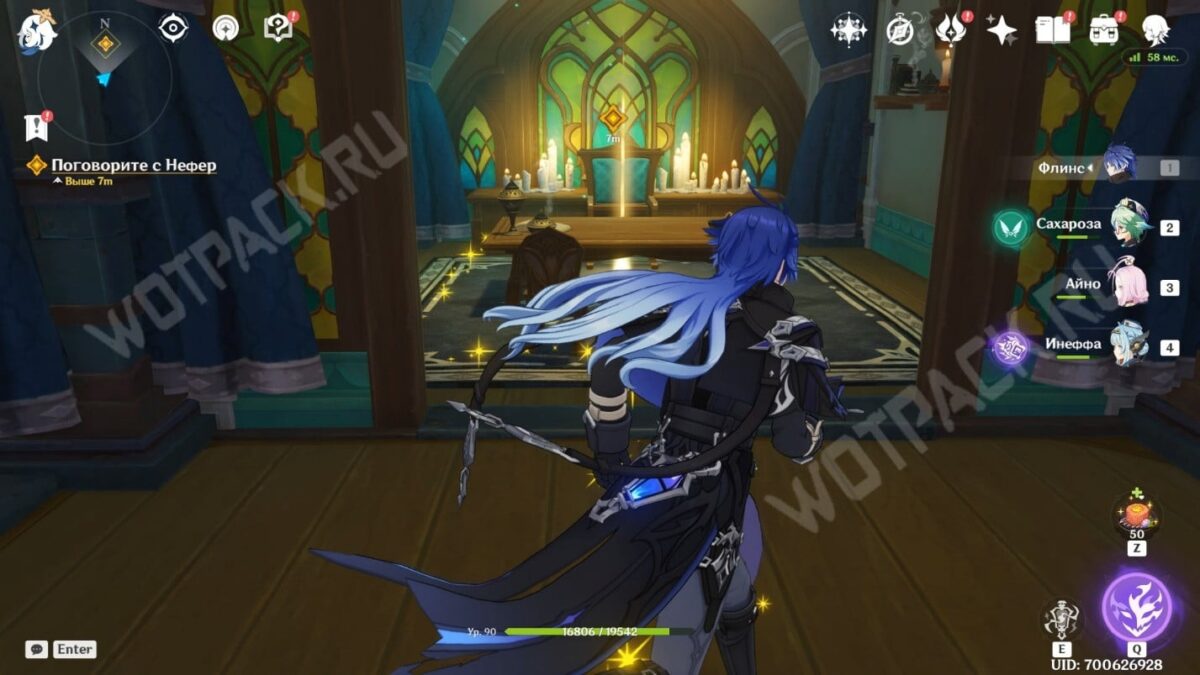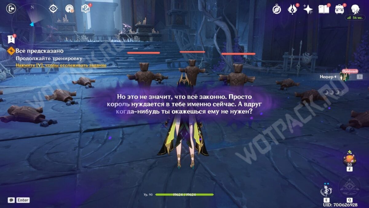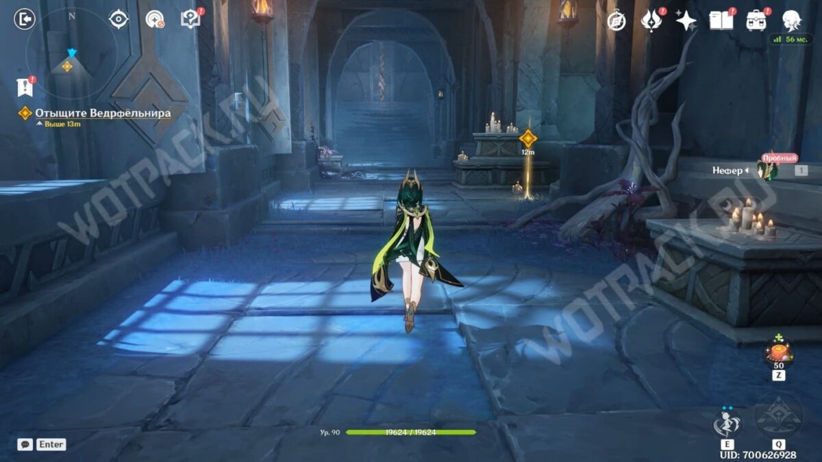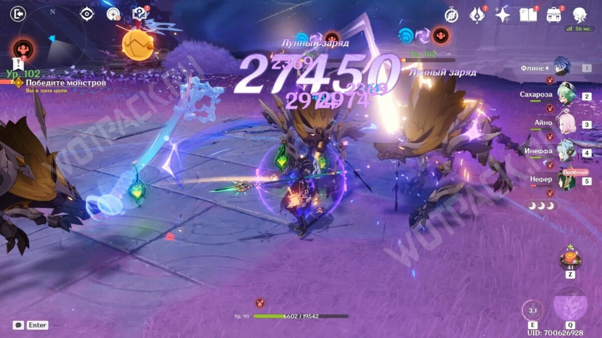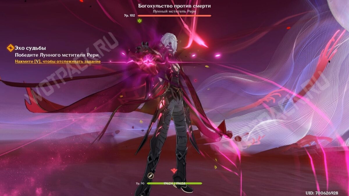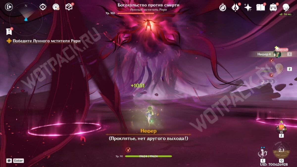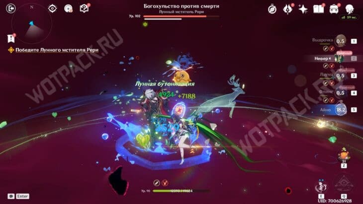 Обсудив действия, дождитесь, пока «Богохульство против смерти» Лунный мститель Рери выберется из шахматной шкатулки. На поле боя окажетесь с отрядом из пяти пробных героев: Нефер, Лаума, Флинс, водный Путешественник и пятый слот займёт Айно, на которую нельзя переключиться. Девочка-изобретатель послужит дополнительной поддержкой и источником Гидро статуса. Её способность можно использовать раз в 20 секунд.