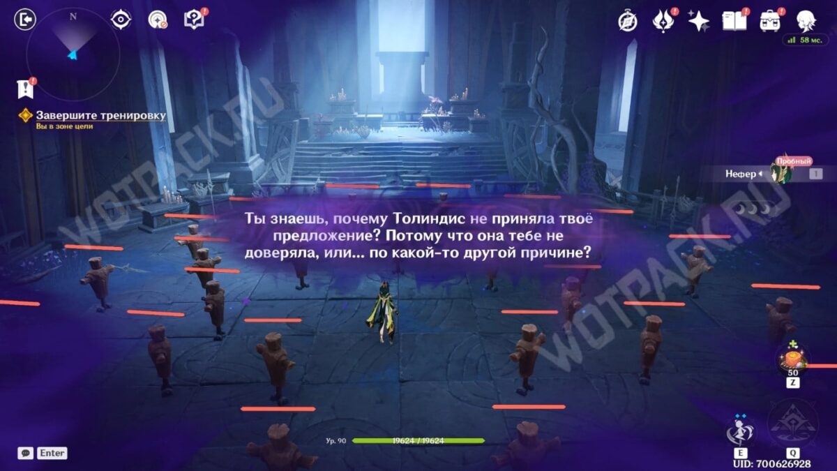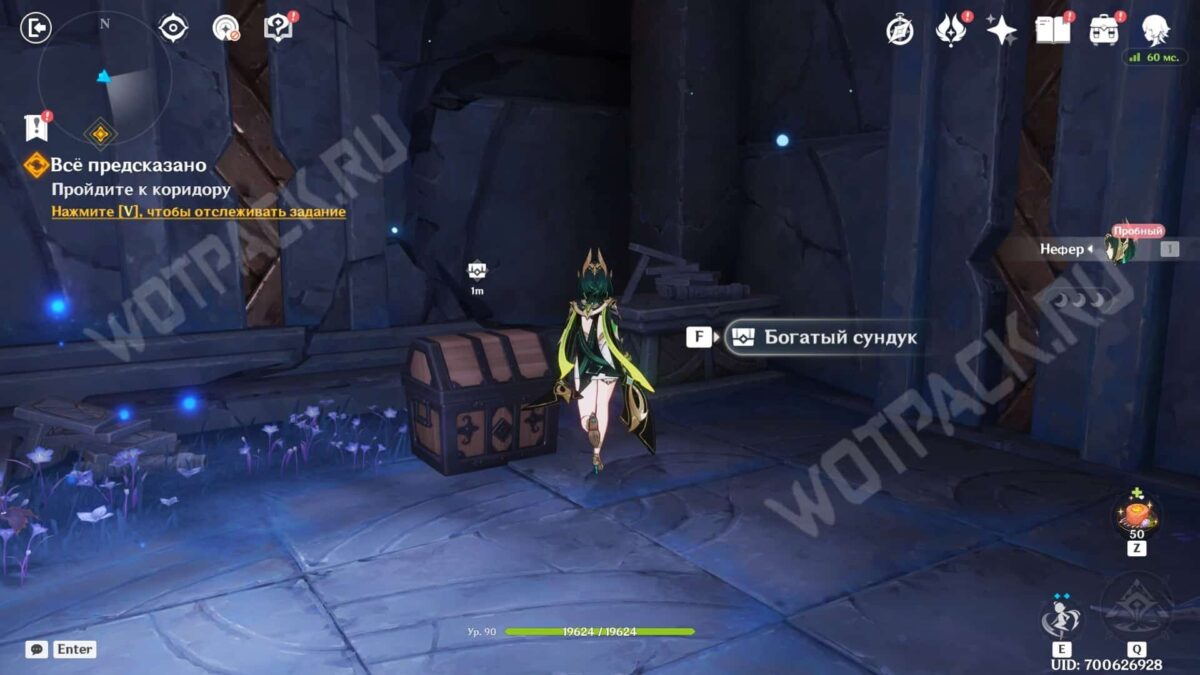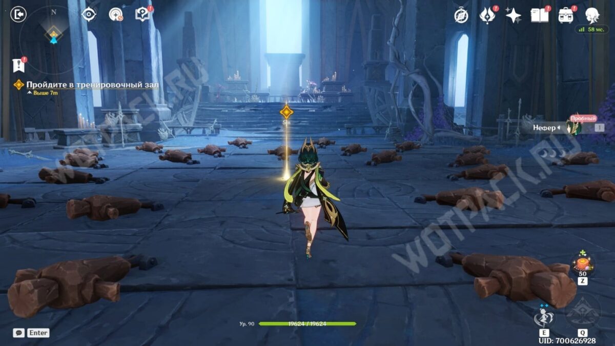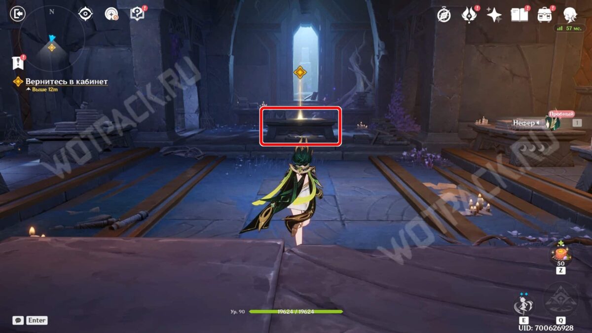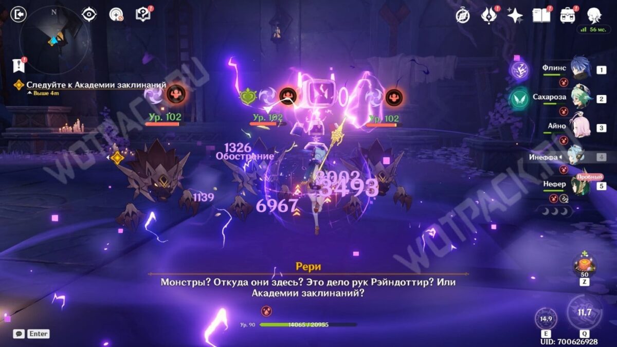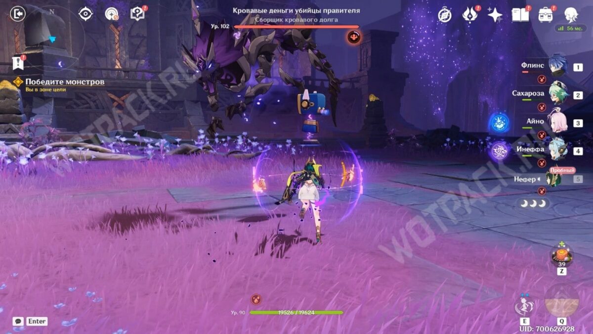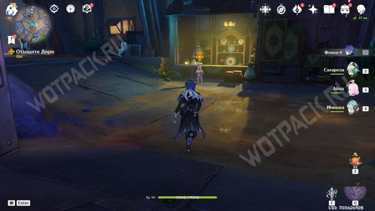 Обсудив действия, дождитесь, пока «Богохульство против смерти» Лунный мститель Рери выберется из шахматной шкатулки. На поле боя окажетесь с отрядом из пяти пробных героев: Нефер, Лаума, Флинс, водный Путешественник и пятый слот займёт Айно, на которую нельзя переключиться. Девочка-изобретатель послужит дополнительной поддержкой и источником Гидро статуса. Её способность можно использовать раз в 20 секунд.