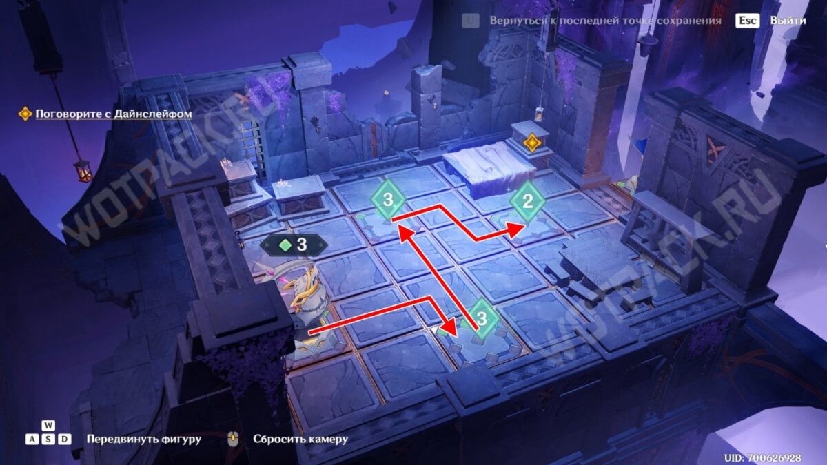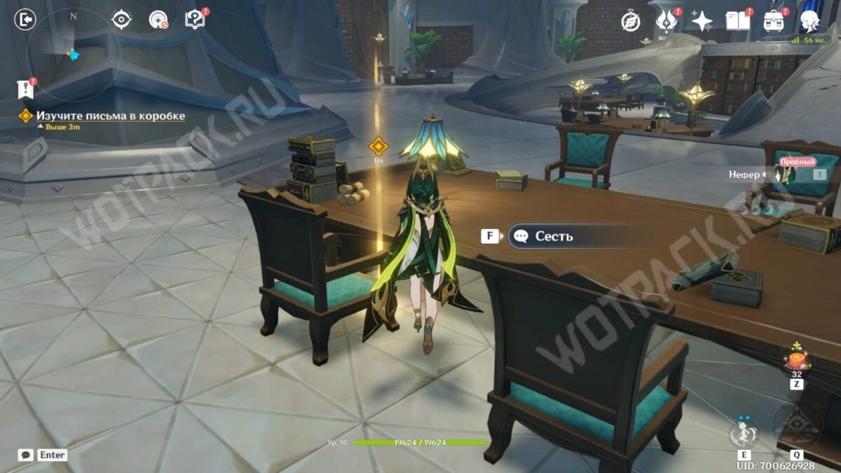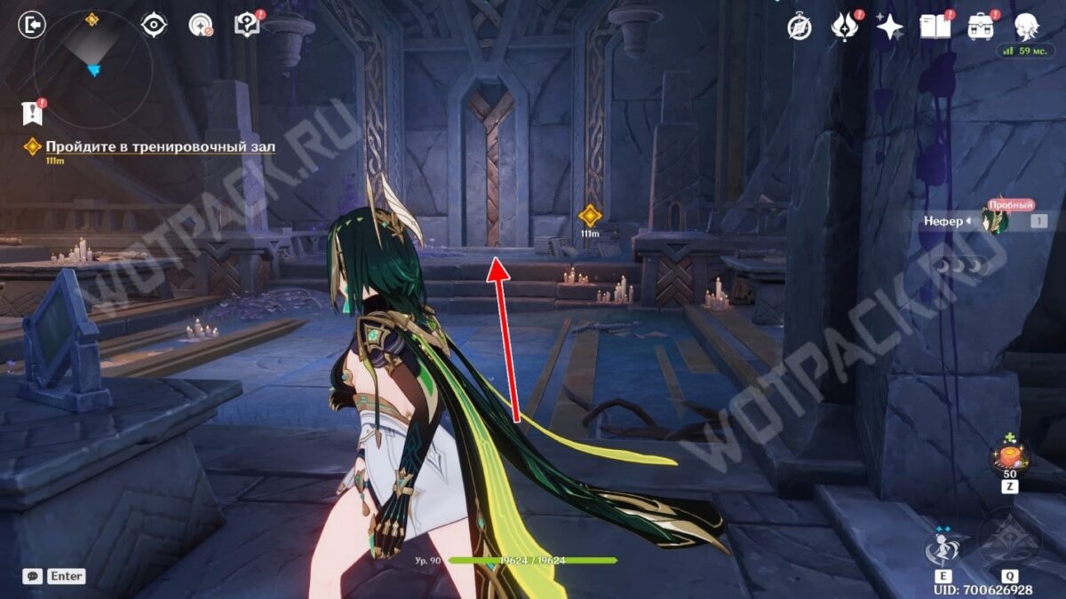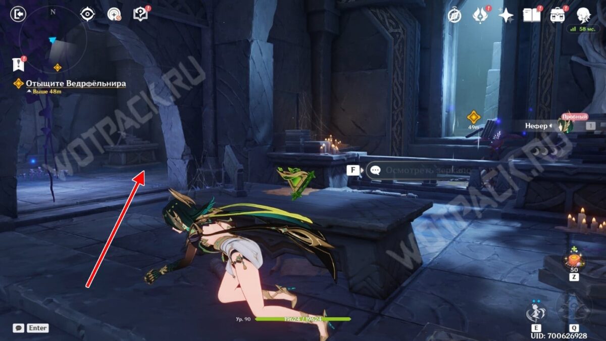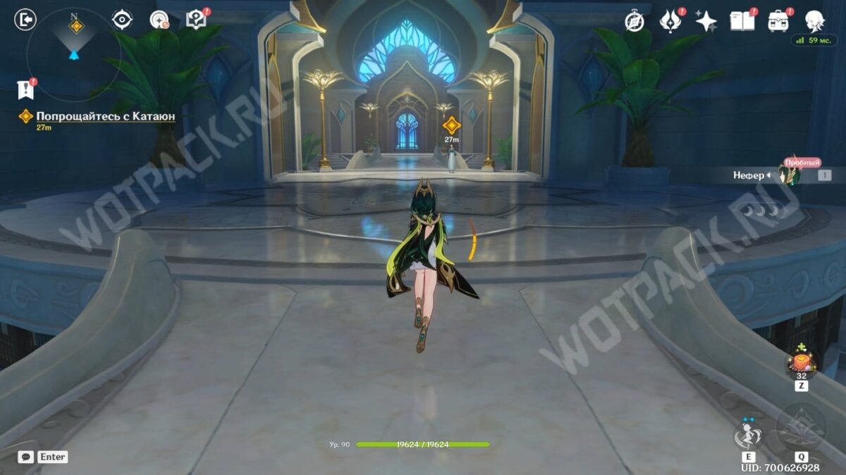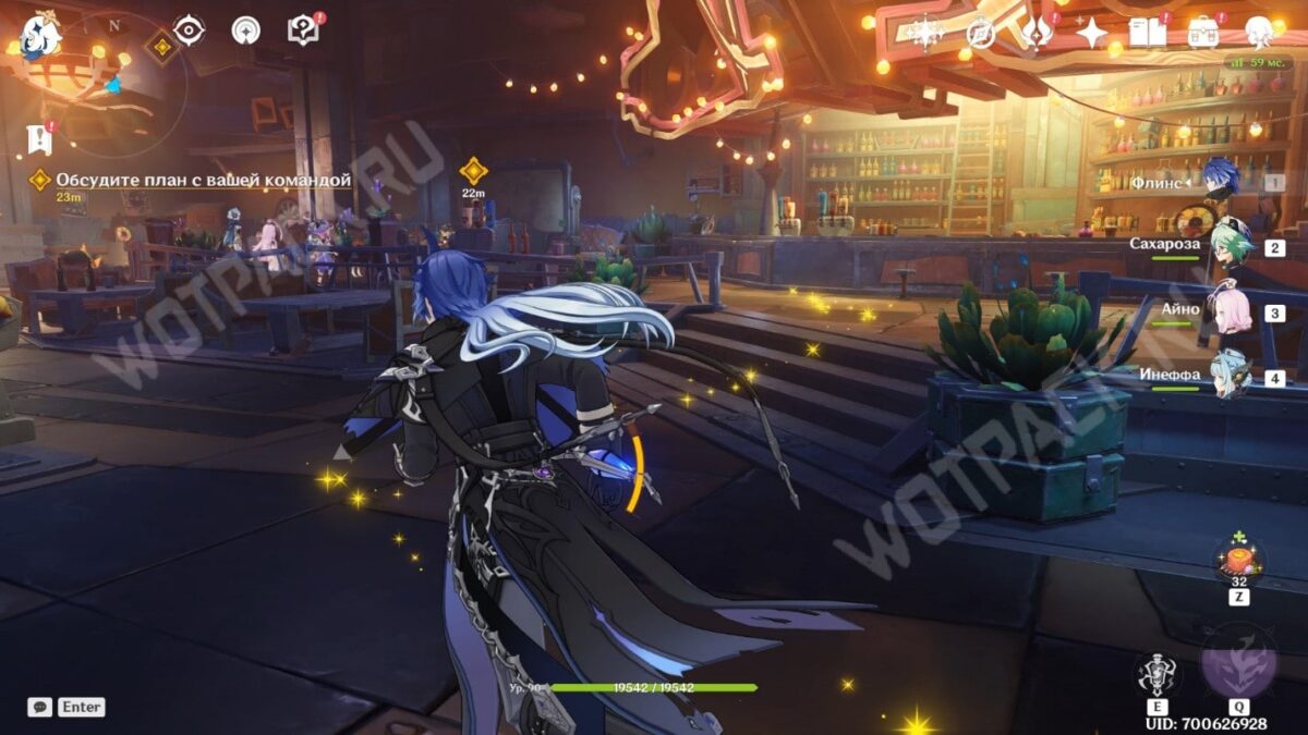 Обсудив действия, дождитесь, пока «Богохульство против смерти» Лунный мститель Рери выберется из шахматной шкатулки. На поле боя окажетесь с отрядом из пяти пробных героев: Нефер, Лаума, Флинс, водный Путешественник и пятый слот займёт Айно, на которую нельзя переключиться. Девочка-изобретатель послужит дополнительной поддержкой и источником Гидро статуса. Её способность можно использовать раз в 20 секунд.