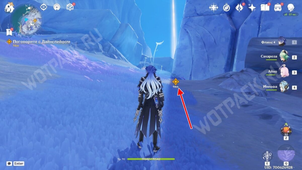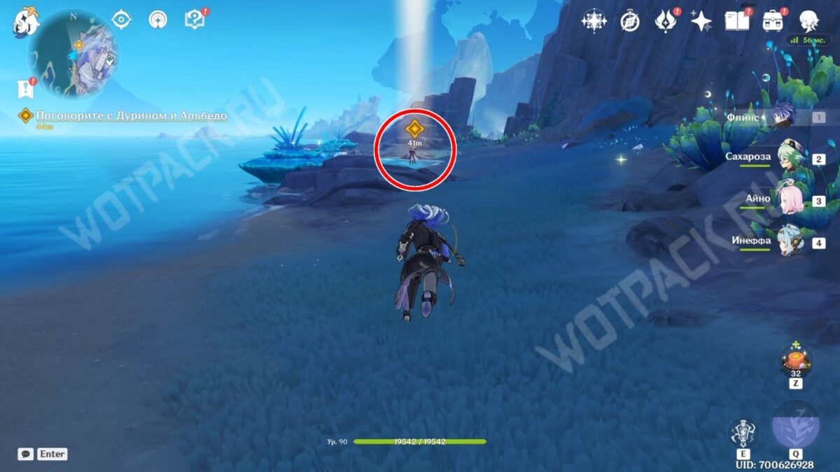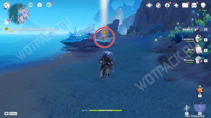 Отправляйтесь на побережье к северу от мастерской «Дзынь-Клац». На подходе встретитесь с друзьями, среди которых будут Лаума, Кирилл, Дева Луны Коломбина, а также недавно прибывшие алхимик Альбедо и дракон Дурин, принявший человеческую форму. Вместе с ними зайдите на базу, где уже ожидают магистр Варка и Дайнслейф.