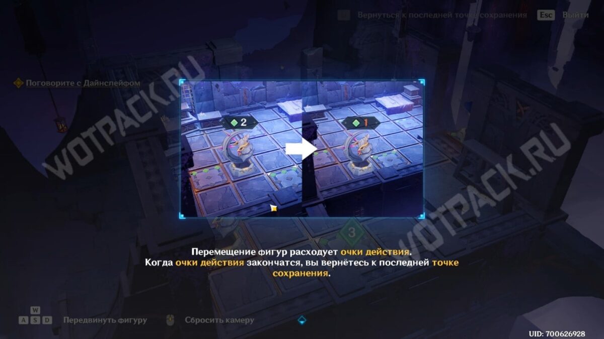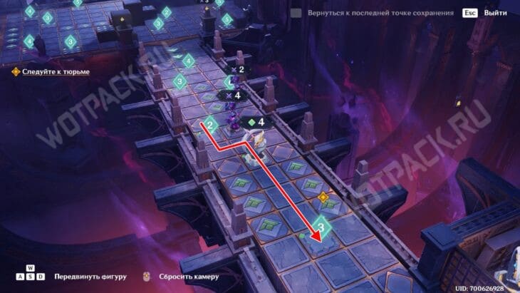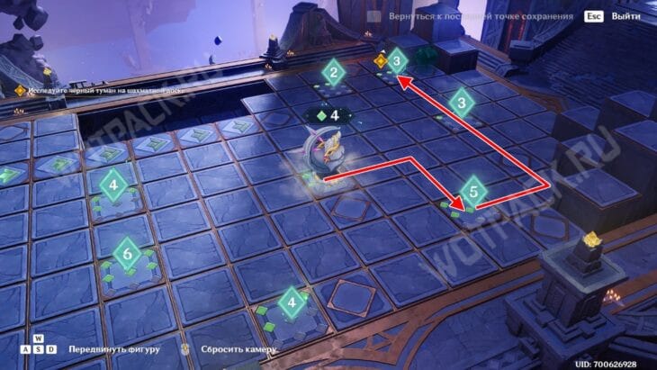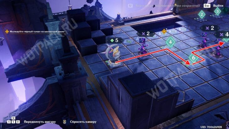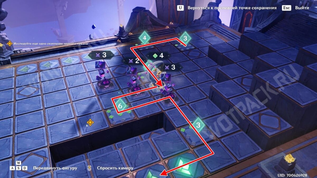 Перемещение производится по клеткам на поле и отнимает очки. Пополнить количество ходов можно, встав на квадрат с числовым обозначением — в этом случае число действий приравняется к указанному над клеткой.