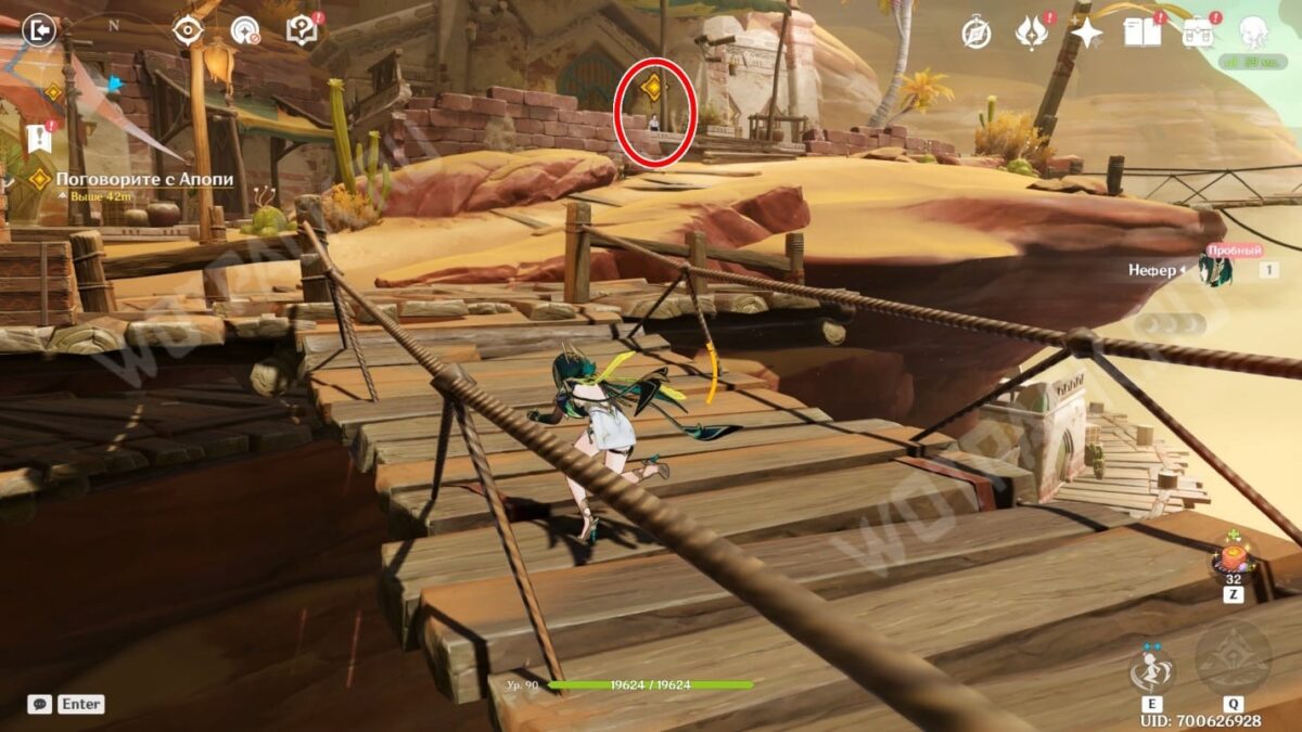 Пересеките подвесной мост в основную часть деревни, а затем идите к большому зданию. Приблизившись, поговорите с Апопи.