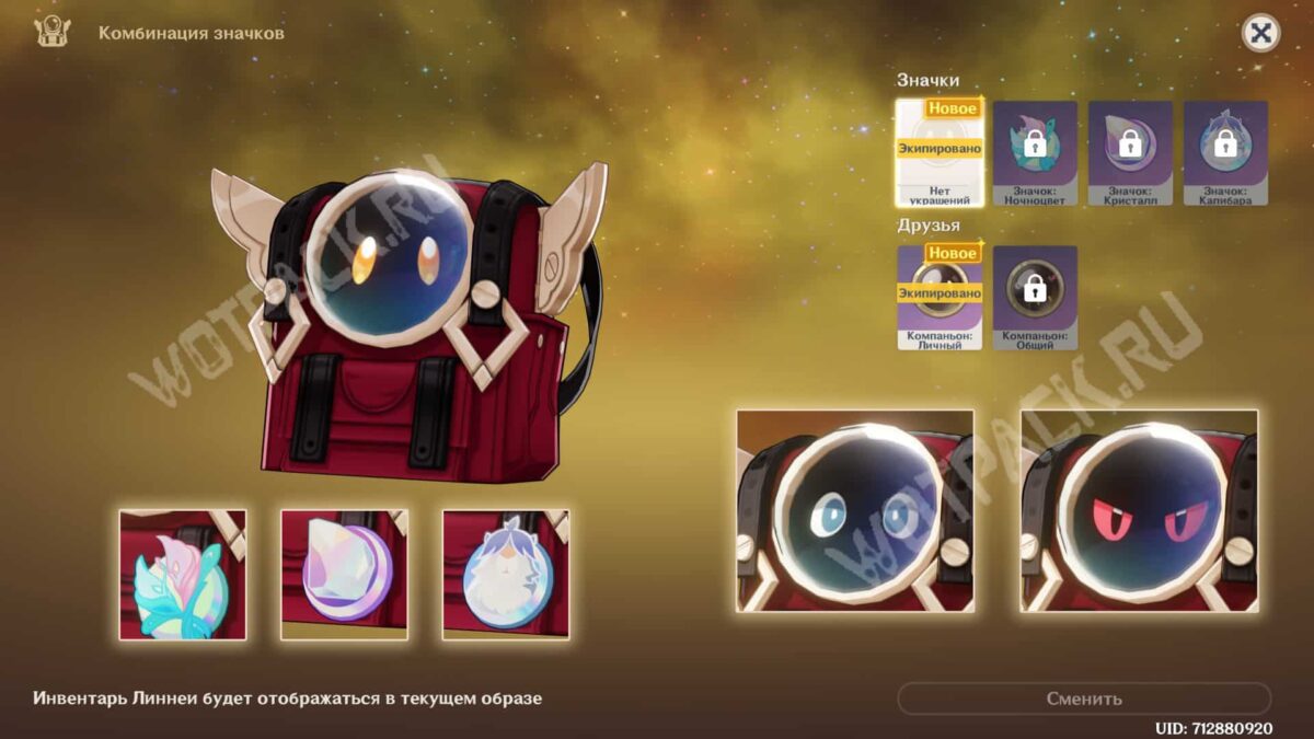 - Значок ночноцвета, кристаллы или капибары крепятся справа снизу. Их можно не устанавливать.