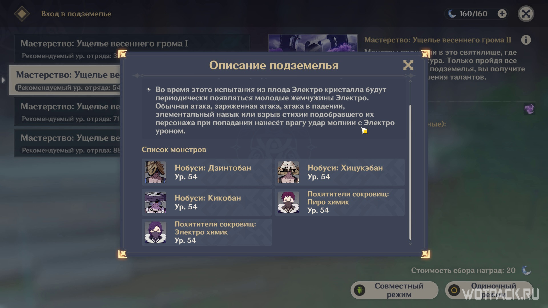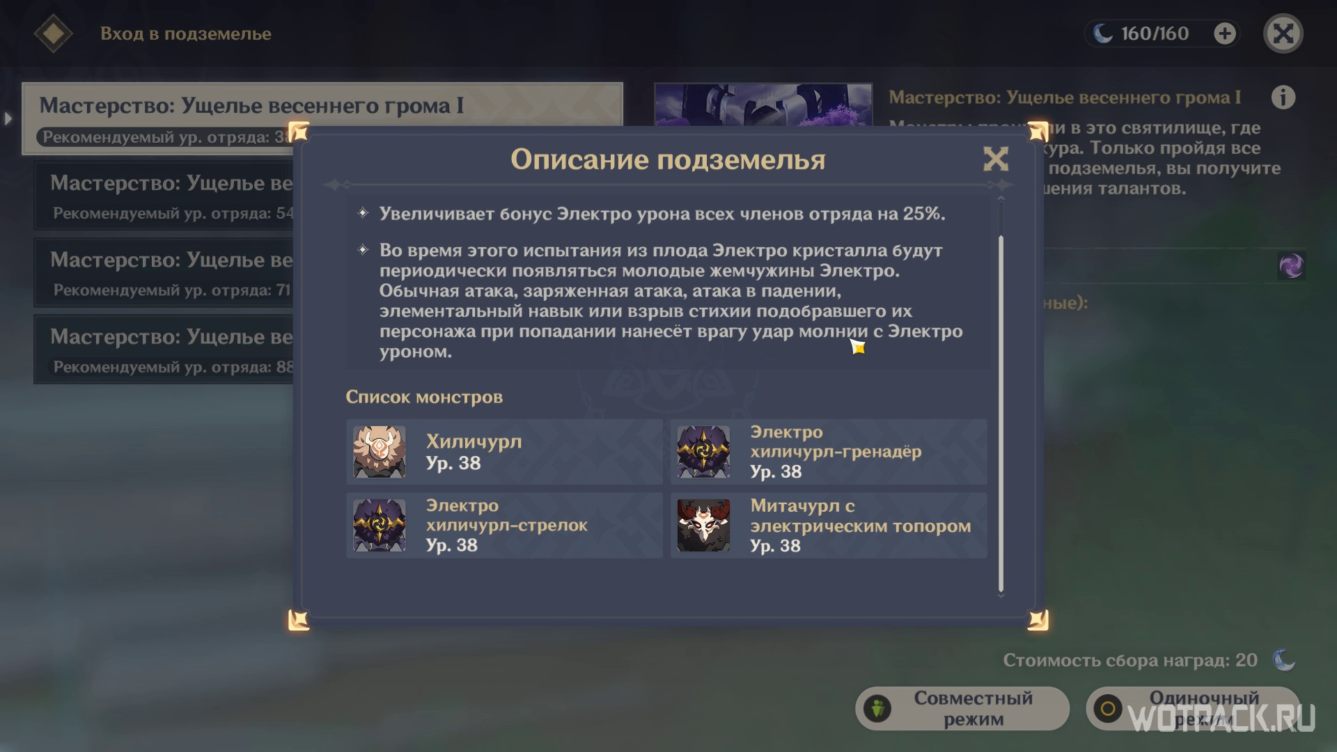 Ростер врагов включает хиличурлов, Электро хиличурлов-стрелков и гренадеров, митачурлов, нобуси, похитителей сокровищ (химиков), кайраги. Враги распределены по группам в зависимости от сложности подземелья. Для открытия уровней сложности повышаем ранг приключений (РП). Пати создаем исходя из рекомендуемой прокачки персонажей (УР):