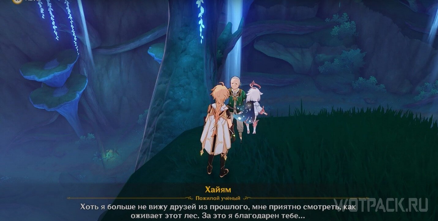 Отправляйтесь в лес Мотиймы и найдите тайный лагерь старого ученого по имени Хайям. Помогите мужчине в поисках образцов растений для проверки одной догадки и проследуйте в пещеру в глубине леса. В благодарность ученый подарит засохший цветок, который нужен для проведения ритуала. В конце Путешественникам также предстоит встретиться с одним старым другом. В награду за прохождение даются следующие награды: