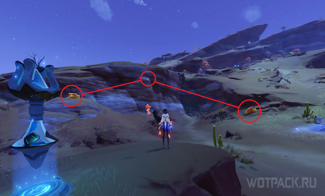 Еще один фрукт и кристалл расположены неподалеку от 3 и 4 точки. Пройдите по ущелью в сторону Статуи Архонта у Оазиса Вурукаша. В самом низу найдете нужные элементы загадки.