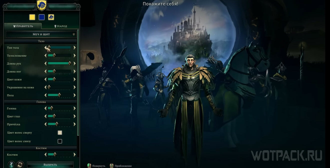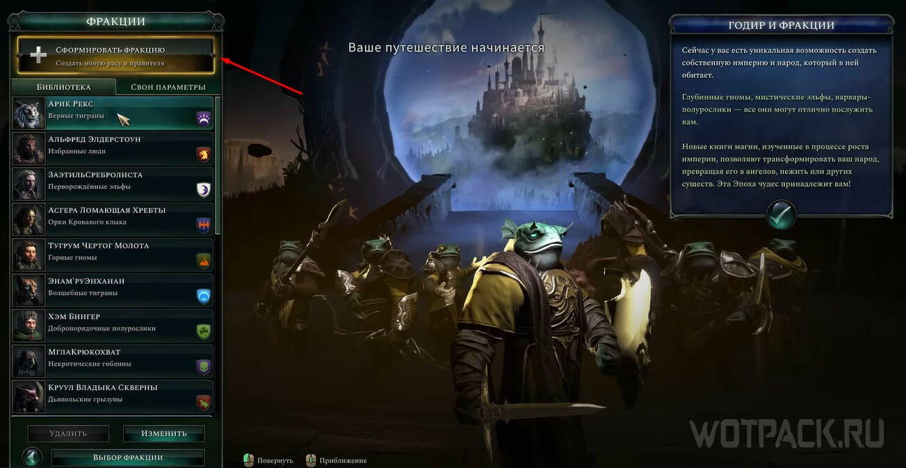 Переход в кастомный режим осуществляется при нажатии на кнопку «Сформировать фракцию». Теперь игрок может сам создать расу и выбрать ей правителя. Фракция будет иметь уникальный набор преимуществ и недостатков. Все это будет отражаться на физической и ментальной жизни подданных.