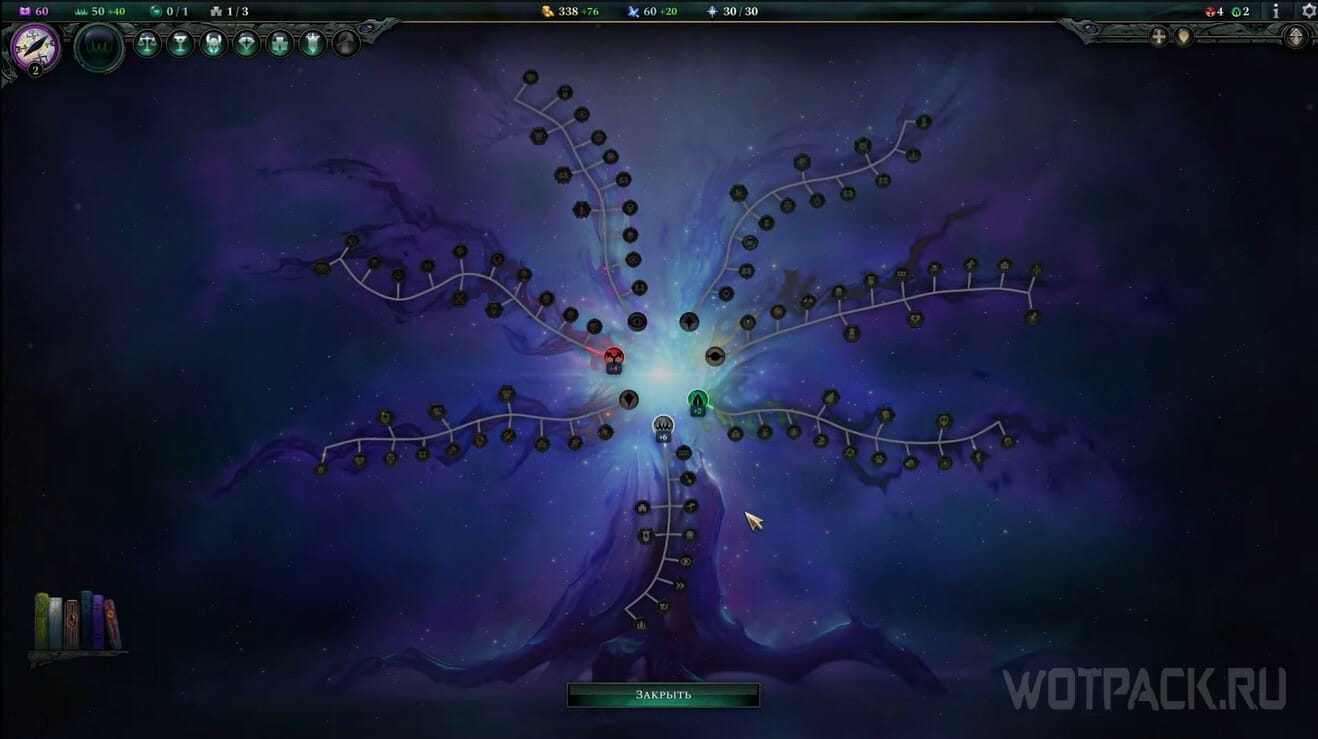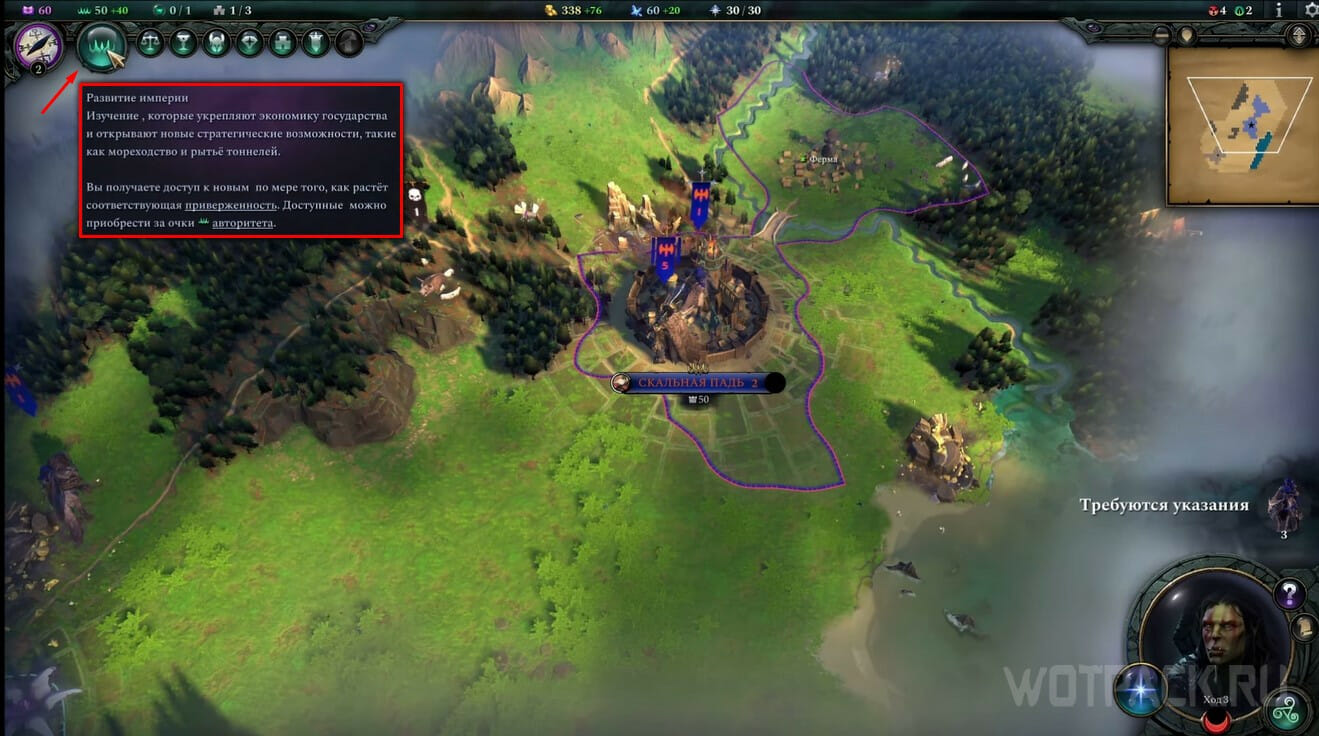 На 3 ходу появится вкладка «развитие империи». При нажатии открывается дерево навыков. На нем показано, какие очки приверженности (очки способностей) определенной стихии имеет фракция, и сколько их. Принадлежность ветке зависит от выбора облика (расы), культуры и магической книги.