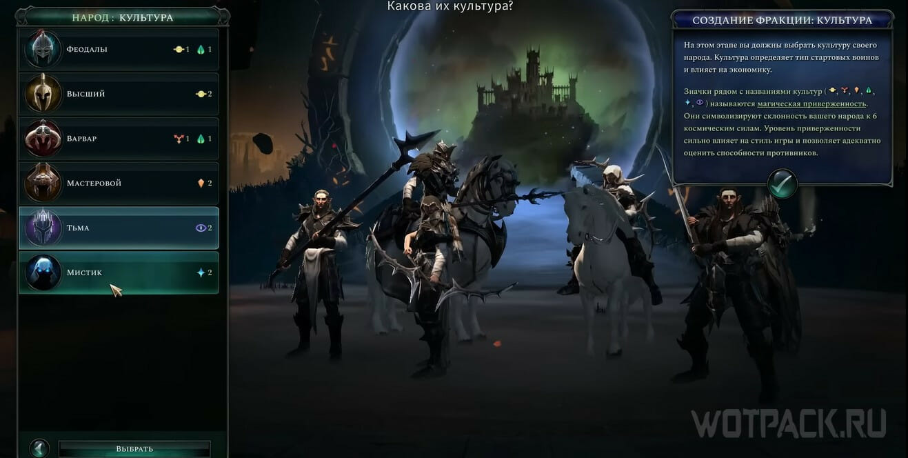 Культура народа является идеологией фракции, ее общим связующим для всех. Каждая из них имеет уникальные постройки, юнитов, глобальные заклинания и навыки лордов. Отдельно стоит отметить последний пункт. Каждый раз после выполнения того или иного условия будет срабатывать определенный бафф. Стоимость его использования — 1 очко.