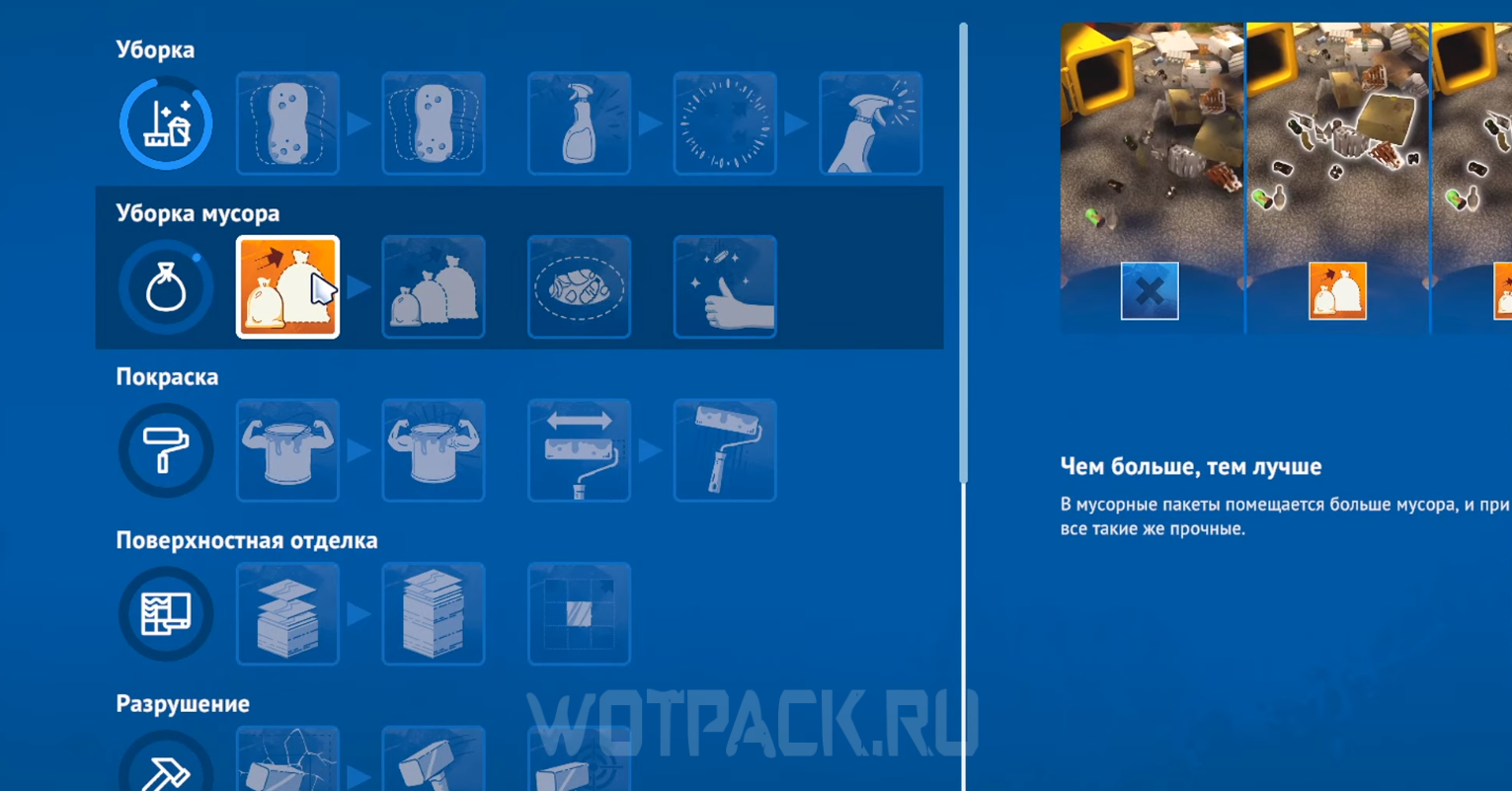 - Ничто не пропадет даром – благодаря данному скиллу сможете разблокировать различные бонусы при уборке мусора, кроме того, собирать всевозможные предметы в мусорные пакеты станет прибыльнее.