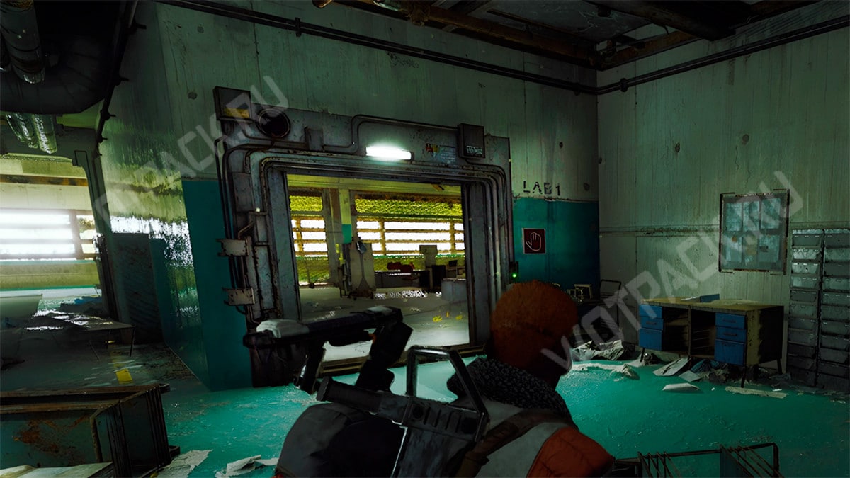 Используя трос в шахте, поднимитесь на второй этаж и двигайтесь прямо по коридору до упора. Затем поверните камеру направо и увидите комнату, справа от которой на стене написано LAB 1 — это и есть лаборатория 1.