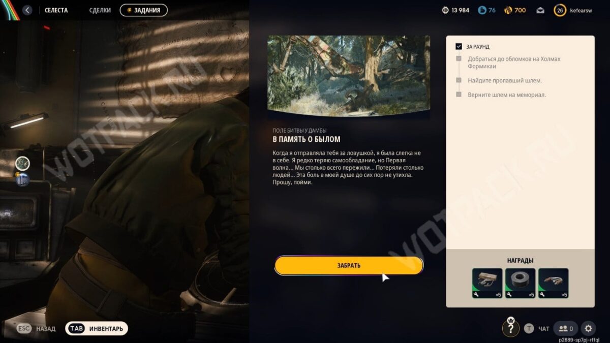 Возьмите и верните шлем на мемориал. Когда памятник будет восстановлен, все задачи квеста засчитаются — можно возвращаться и забирать награду у Селесты.