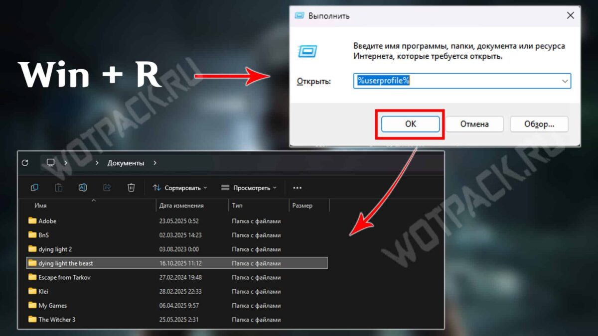 Для удобства вызовите диалоговое окно «Выполнить» сочетанием клавиш Win+R и введите в поле «%userprofile%». После нажатия «ОК» откроется раздел проводника с хранилищем пользователя. Зайдите в «Документы» и откройте папку с названием игры — в ней лежит save-файл.