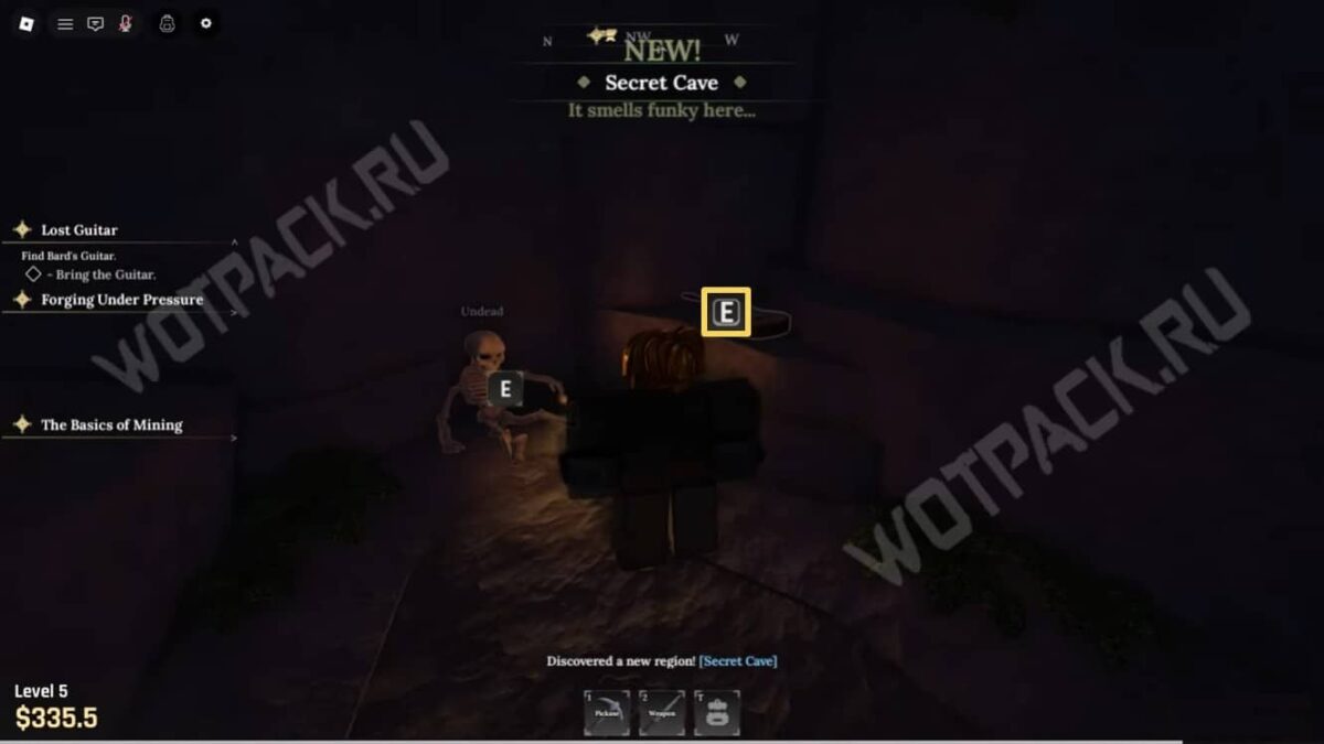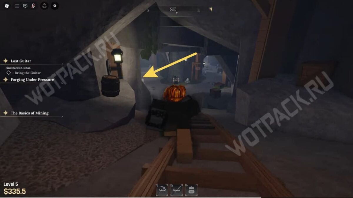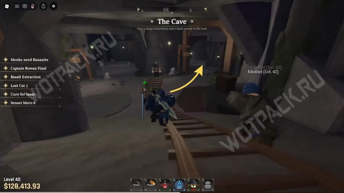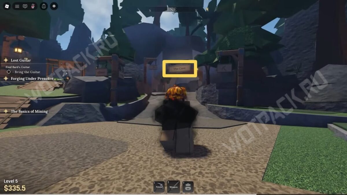Приступив к миссии, увидите в противоположной стороне от НПС пещеру [The Cave] — к ней также будут вести указатели, на которых изображена кирка.