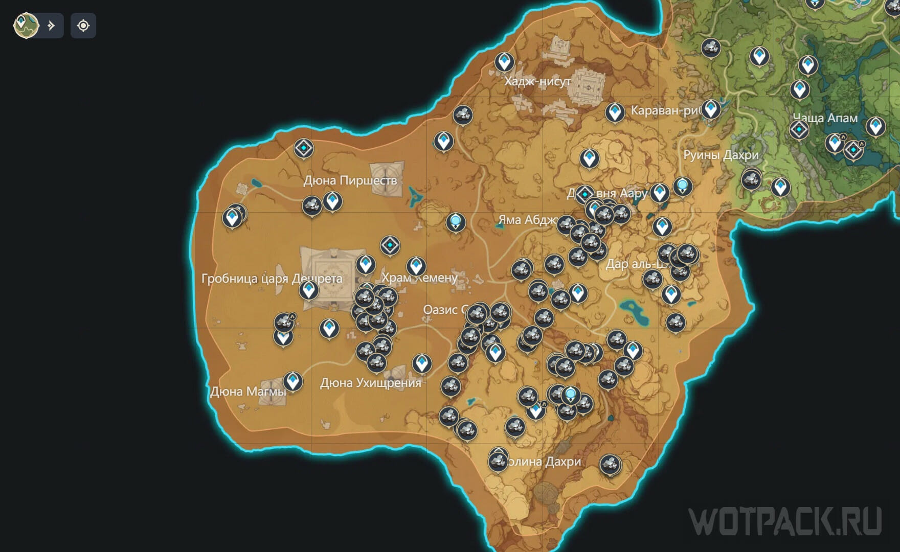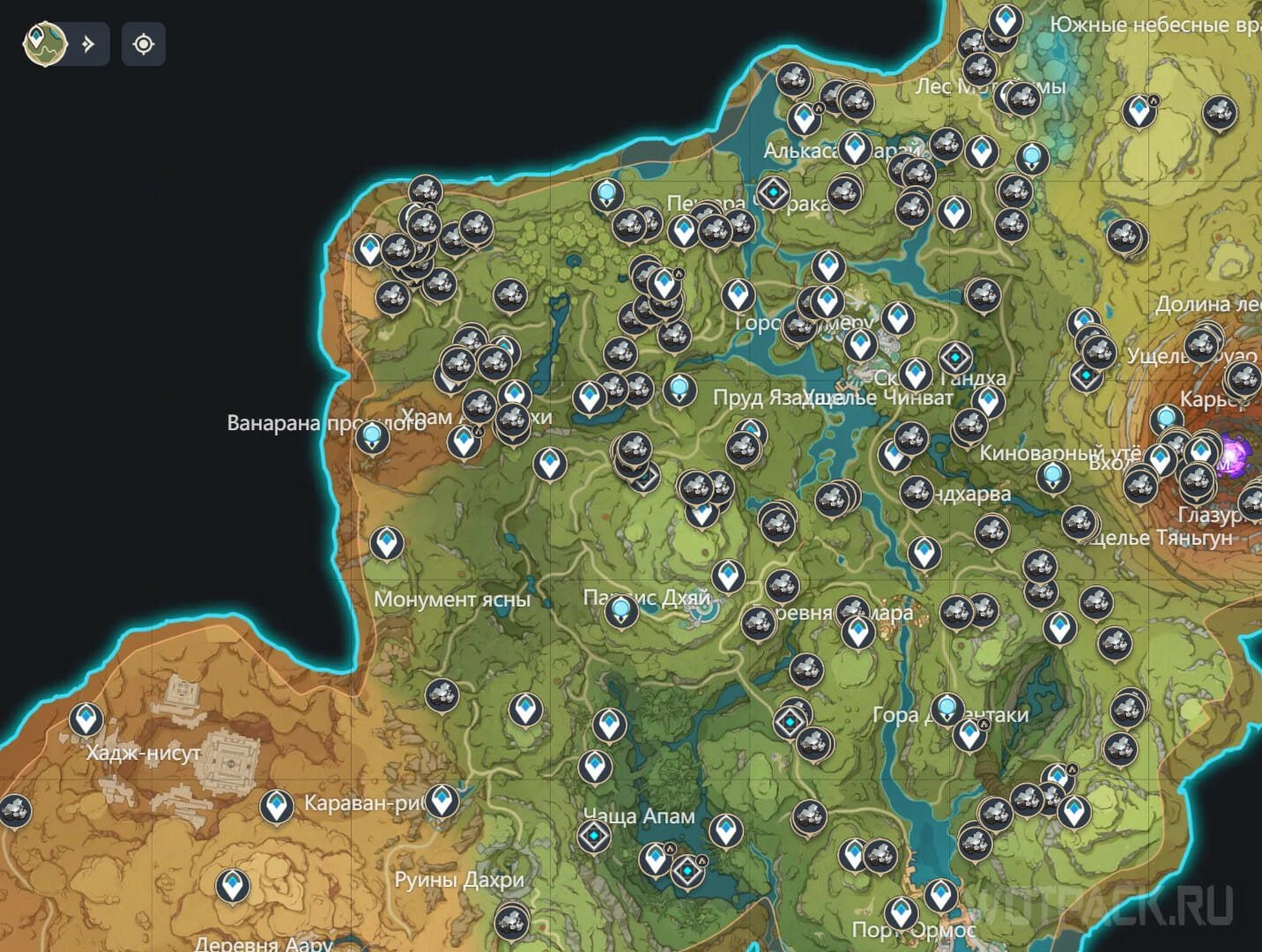 Дендро королевство — кладезь полезных ресурсов. Найти руду белого железа можно по всей территории Сумеру, в том числе и в безжизненных пустынях. Однако сбор материала усложняется многоуровневостью территории, ведь некоторые жилы, отмеченные на карте, могут быть спрятаны глубоко в пещерах.