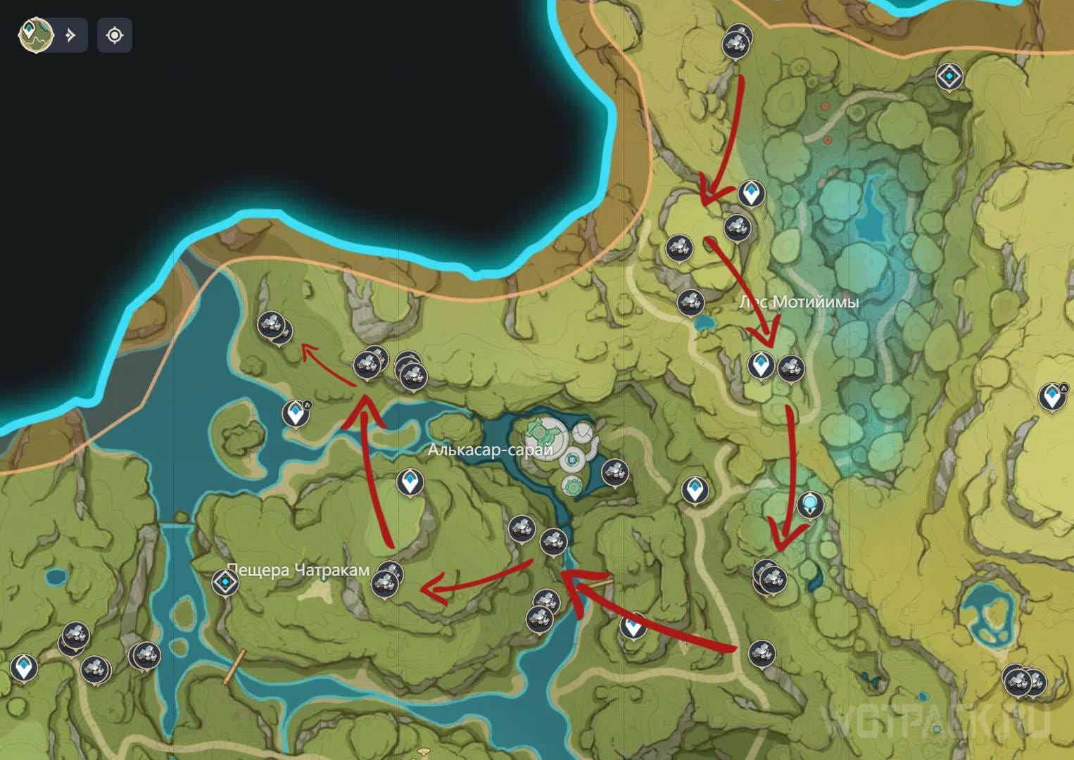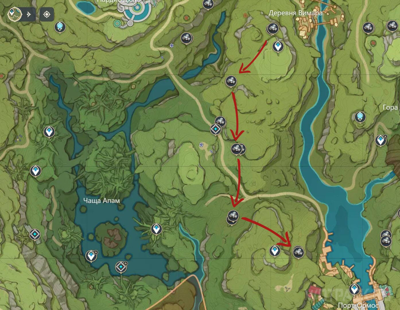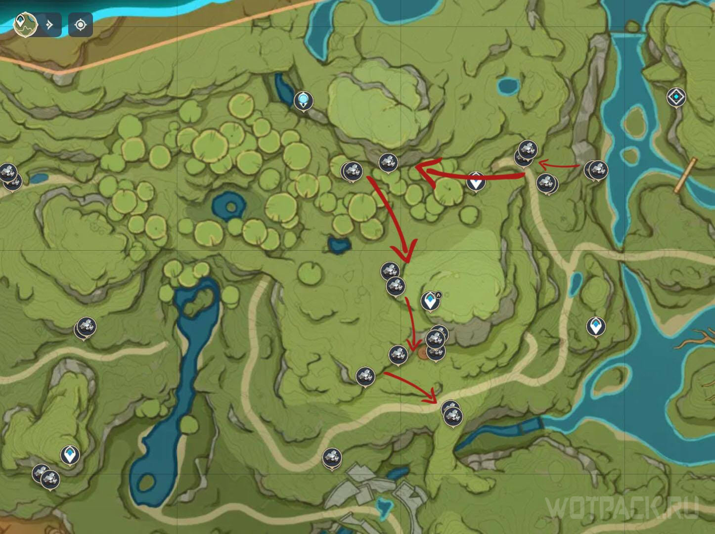 Начинайте майнить железо в районе 3-х путевых точек, указанных на карте. Это снизит время на передвижение до месторождений. Рядом с ними всегда охрана в виде хиличурлов или охотников за сокровищами. За 15 минут легко заработать 35-40 кусков необходимого ресурса.