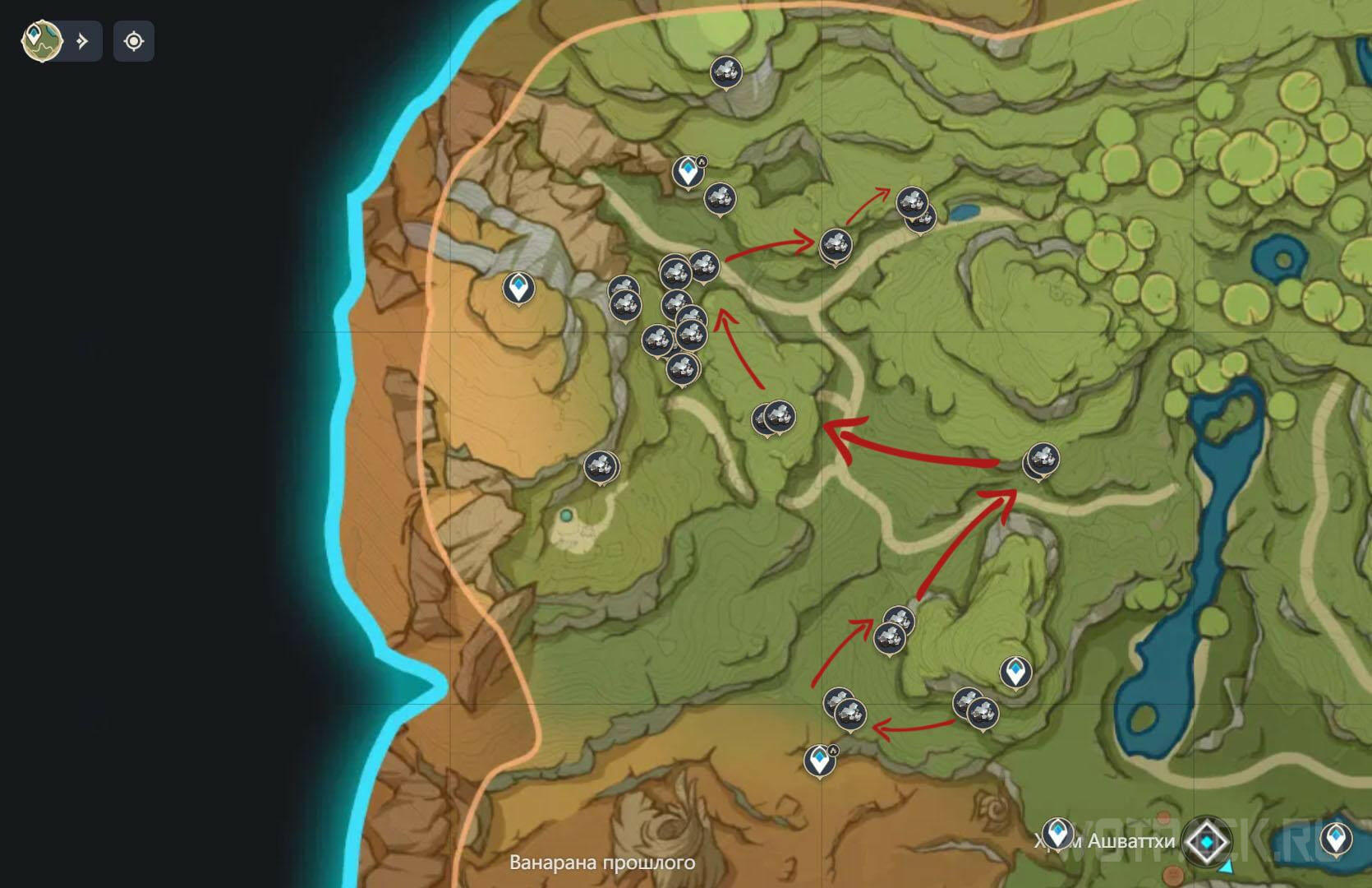 Начните с востока от поселения Аранар и двигайтесь в его центр. Поднимитесь на возвышенность и завершите фарм недалеко от лугов Вишудхи. Пройдя по предложенному маршруту, соберете 18 штук материала.