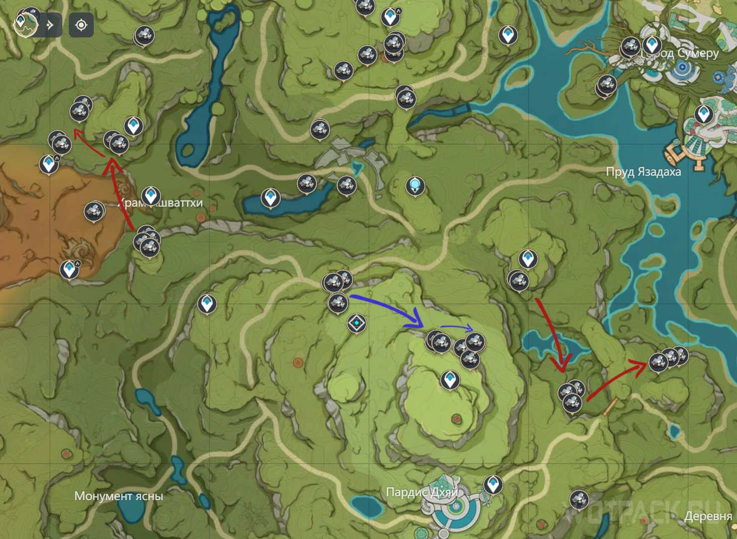 Два маршрута фарма можно составить в восточной части лугов Вишудхи. Синими указателями отмечен подземный маршрут. От подземелья Фрагмент детских снов пройдите по пещерам, кишащим враждебными механизмами, на восток, чтобы собрать около 11 кусков железа.
