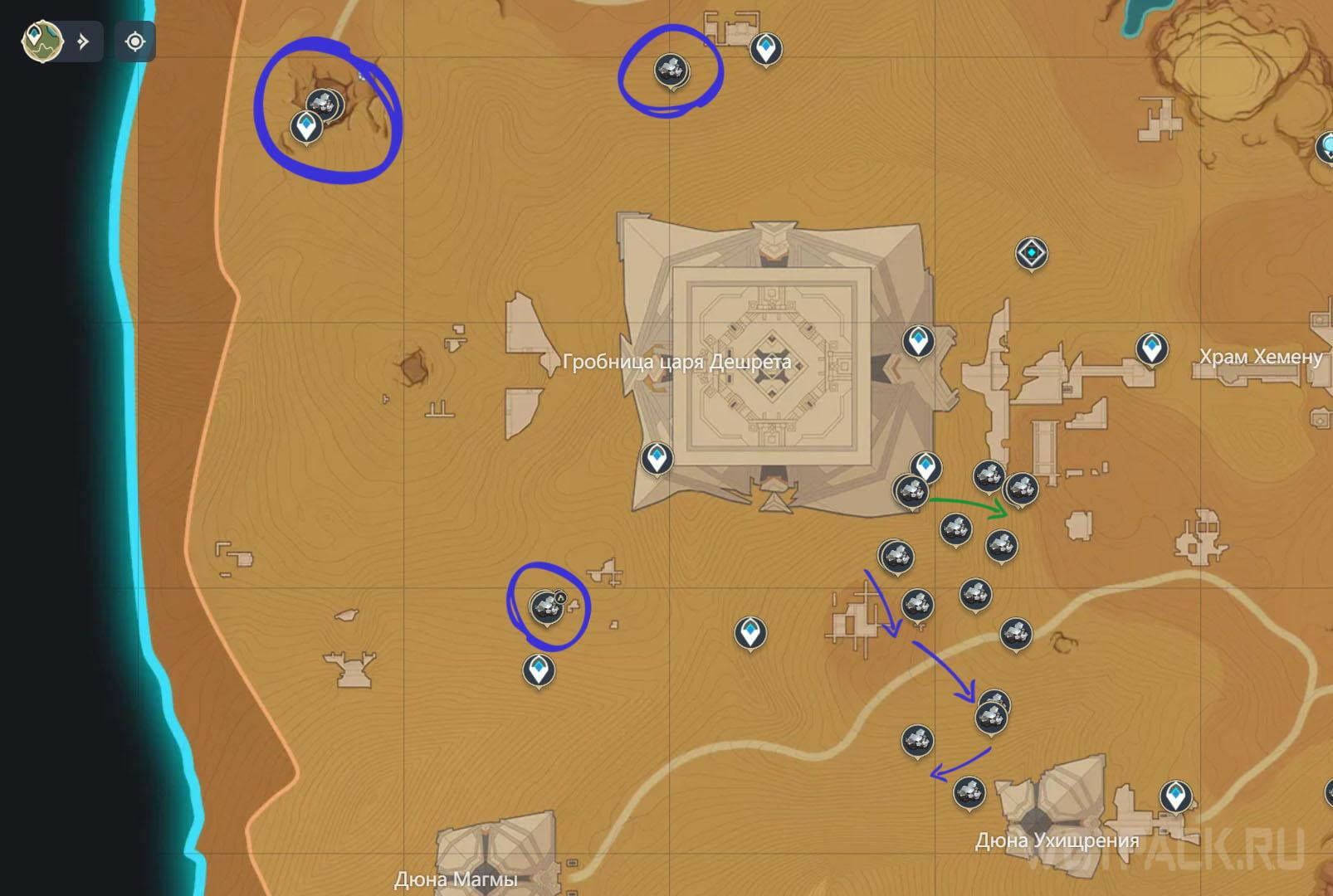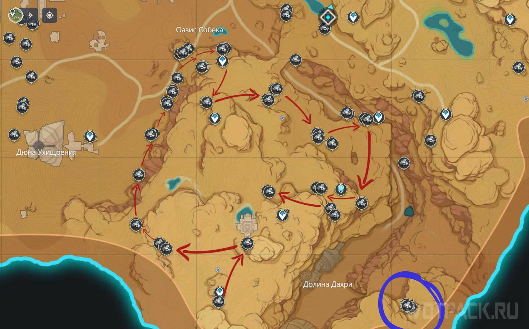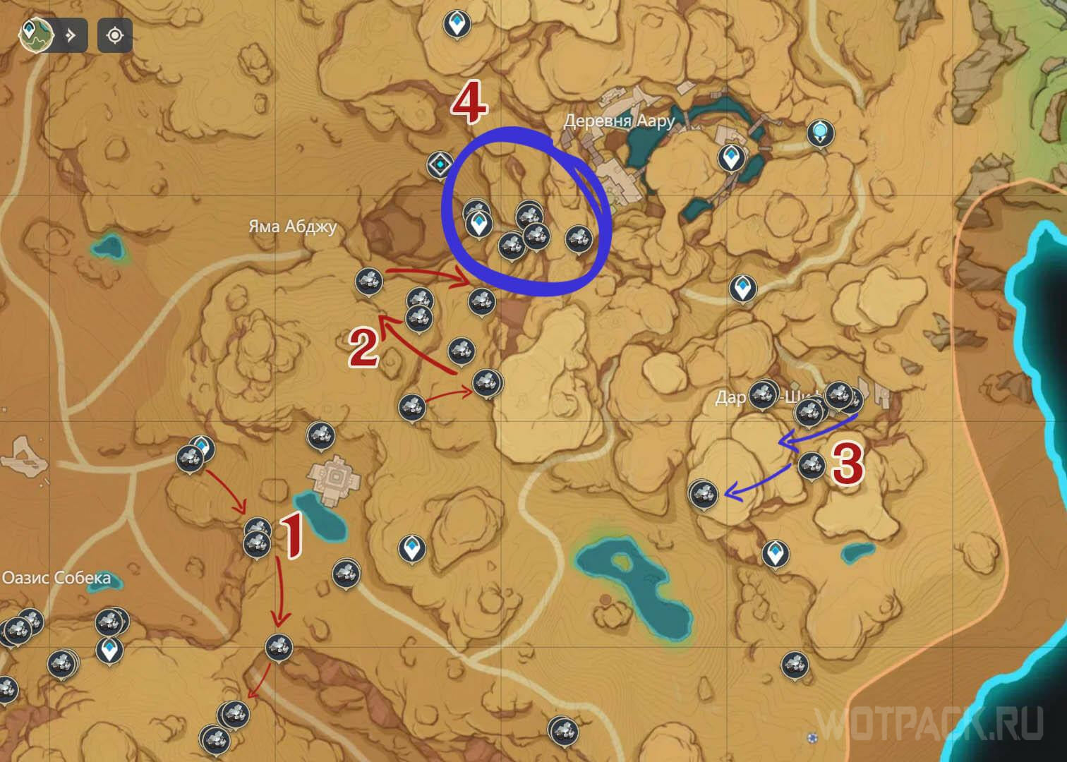 Длинный и удобный маршрут можно составить в локации Земля верхнего Сетеха. Начинайте от самой южной точки телепортации на возвышенности и идите по указанному пути, обходя по кругу плато. За один круг получится добыть не менее 49 единиц ресурса.