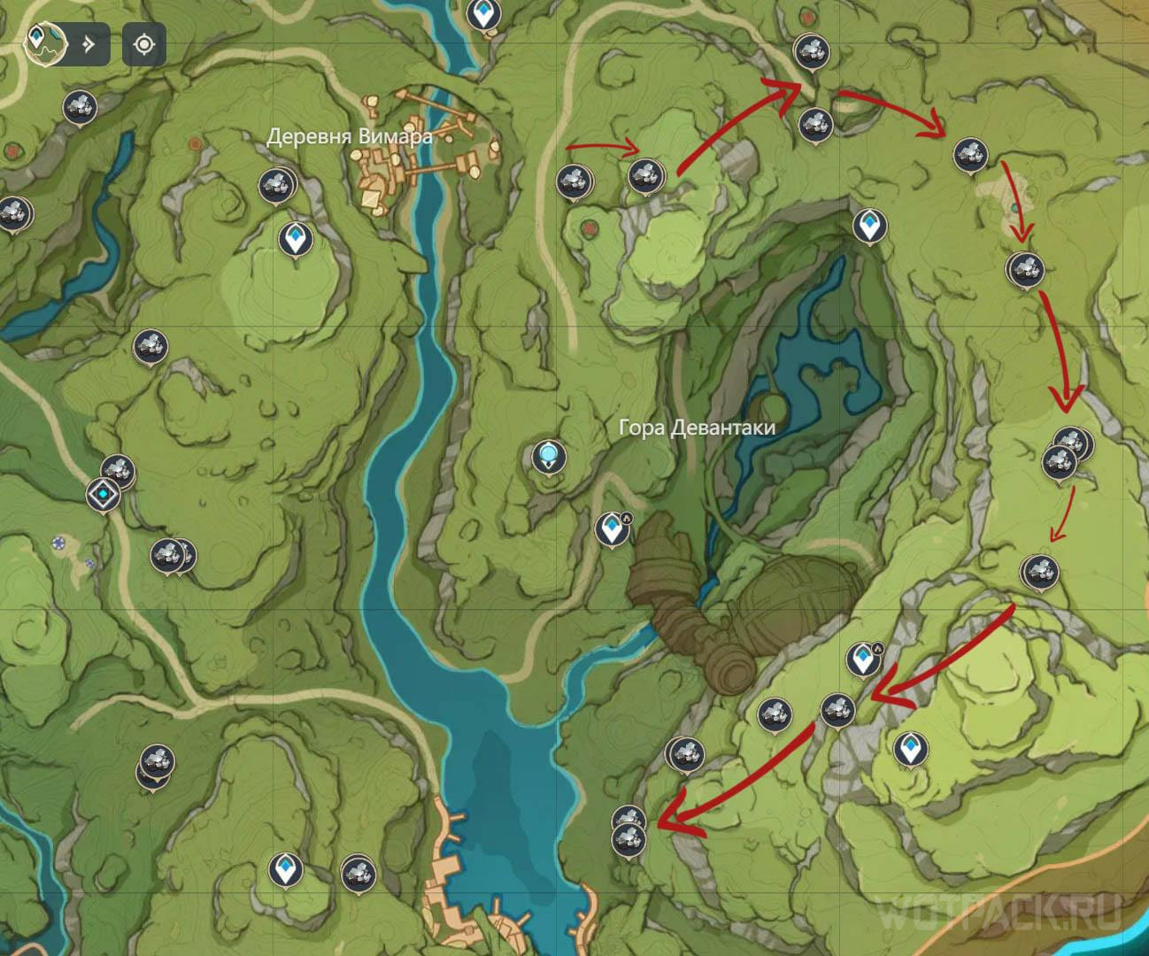 Одна из самых богатых на белое железо областей в игре. Маршрута, как такового, нет, ведь гора буквально облеплена месторождениями со всех сторон. Лучше всего, если в команде будет Нин Гуан: талант Рог изобилия покажет свою полезность в вертикальной местности, фиксируя местоположение руды. Заход даст ~30 ед.