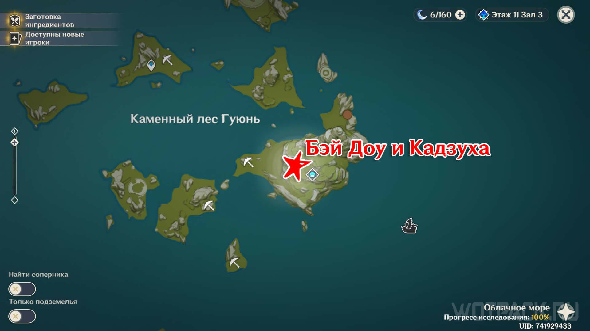 Капитана Бэй Доу и Кадзуху найдете у данжа Владения Гуюнь на островах одноименного Каменного леса. С друзьями также нельзя поговорить лично, но можно услышать диалог между ними. Бэй Доу удивится, что за время отсутствия Кадзуха смог стать мастером Священного призыва семерых. Услышав, что его противником была Ху Тао, Бэй Доу решит познакомиться с ней лично и даже пригласить на борт корабля.