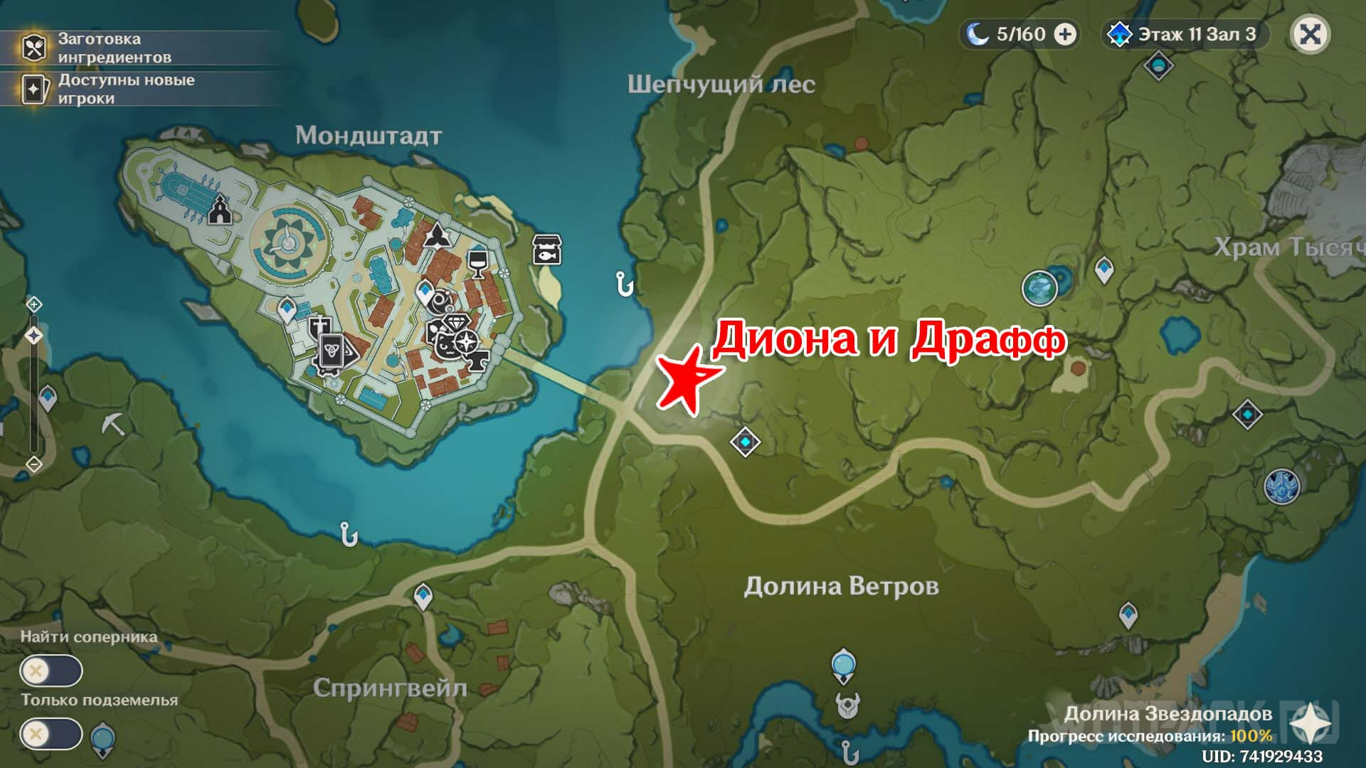 У точки телепортации напротив главных ворот Мондштадта можно отыскать Диону и ее отца Драффа. Поговорить с ними лично не получится, но удастся услышать диалог между отцом и дочерью. Диона предложит Драффу сыграть в Священный призыв семерых, а мужчина, чтобы задобрить дочь, пообещает не выпивать целый день.