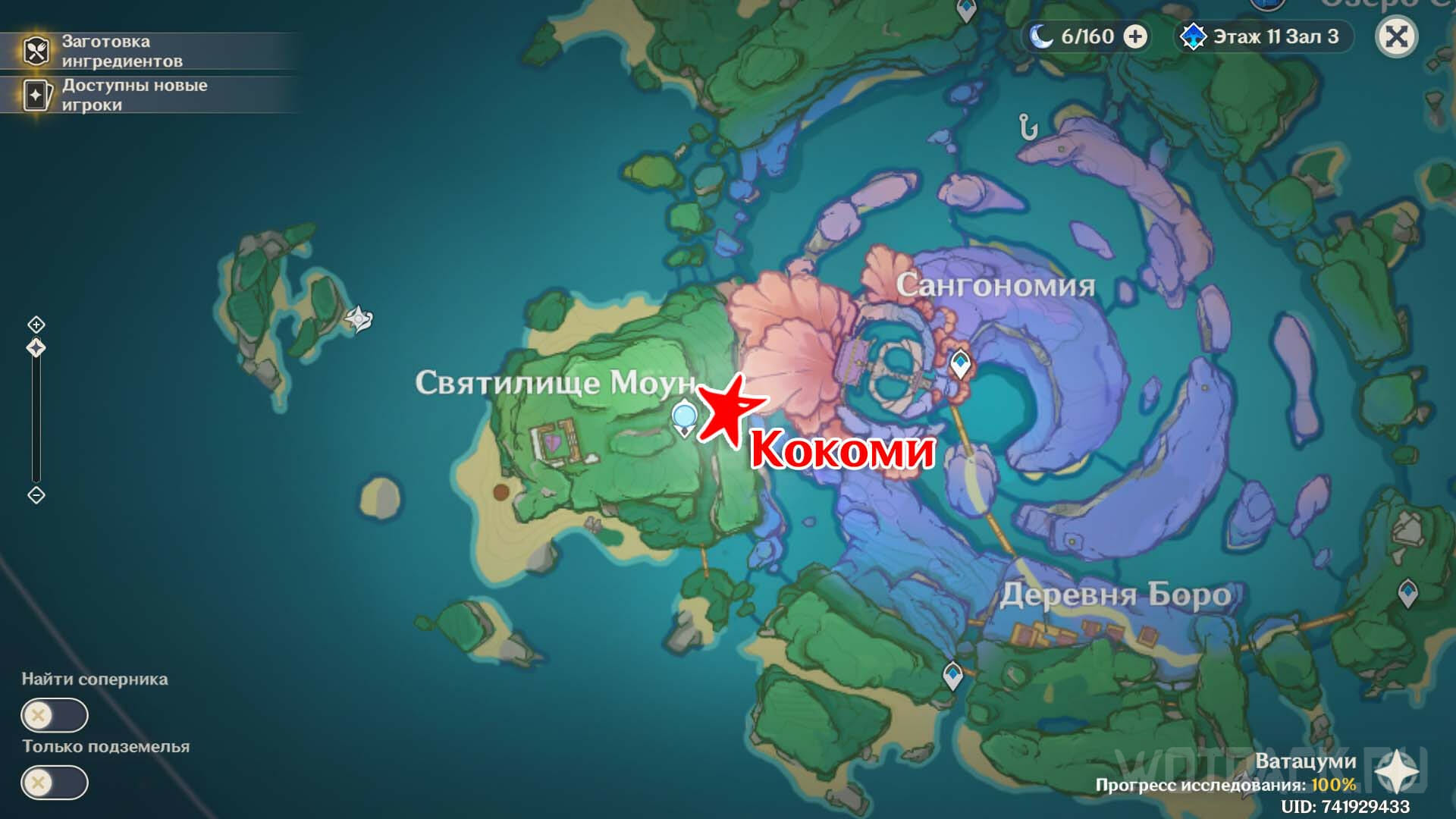 Рядом со статуей Архонта на острове Ватацуми находится Кокоми. Девушка любуется пейзажами родного острова и готова побеседовать с Путешественником. В разговоре можно выбрать две темы: