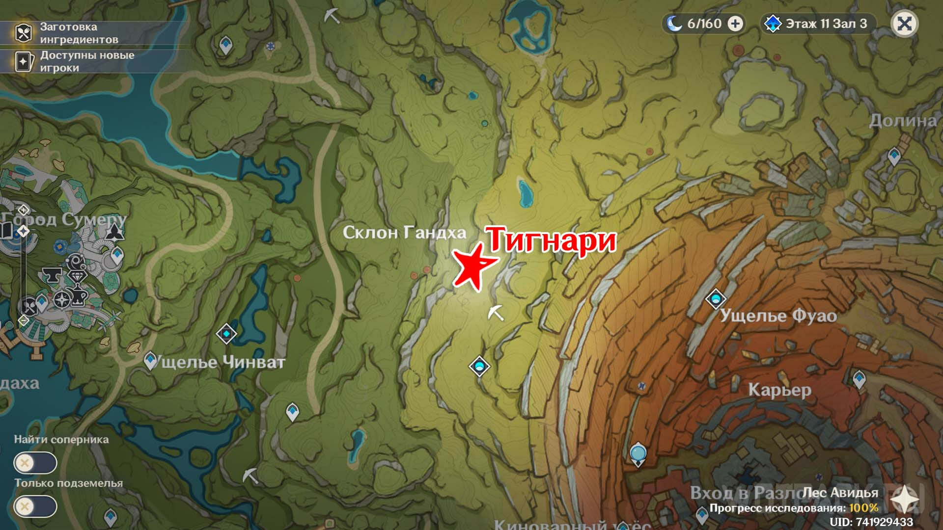 У точки телепортации, к северу от подземелья Шпиль одинокого просветления, найдете Тигнари. Так как лесной страж стоит один, то сможете поговорить с ним лично. В разговоре можно выбрать следующие темы: