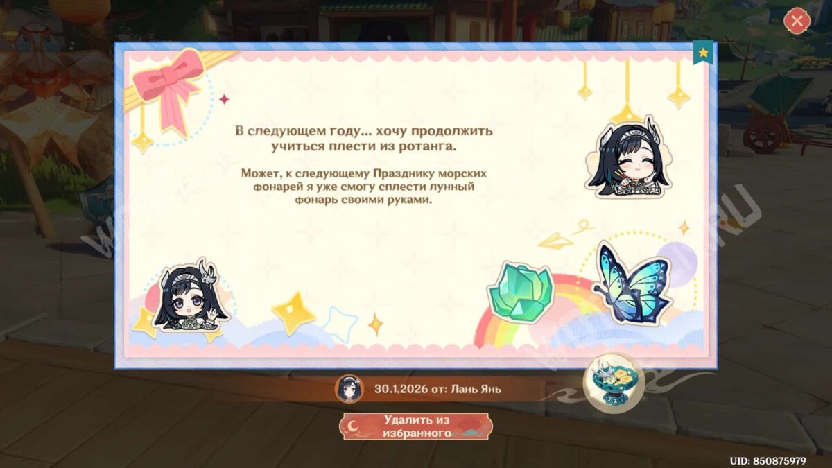 Когда диалог завершится, рядом с героиней останется фонарь, декорированный в её личном стиле. Прикоснувшись к нему, можно забрать уникальное блюдо и поздравления от неё.