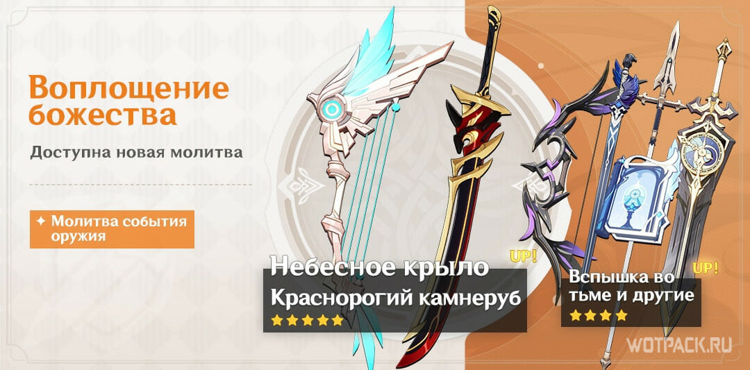 В оружейном баннере помимо сигнатурного оружия для Аратаки Итто – 5⭐️Краснорогий камнедробитель, добавят также лук – 5⭐️Небесное Крыло. Среди 4⭐️ можно будет достать: лук – Вальс Нирваны ночи, меч – Вспышка во тьме, копье – Фавония, клеймор – Меч-колокол, катализатор – Церемониальные мемуары.