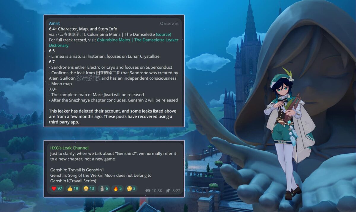 Самым обсуждаемым сливом от пользователя 八云寺幽幽子, удалившего свой аккаунт на китайском форме Tieba, стала информация о второй части проекта, который может выйти после Снежной (в 2027 году или позже). Это прокомментировал hxg_diluc, заявив, что «Genshin Impact 2» станет новой главой, а не другой игрой. Многие фанаты ошибочно считают, что потеряют своих персонажей и им придётся начинать с нуля, но это не так.