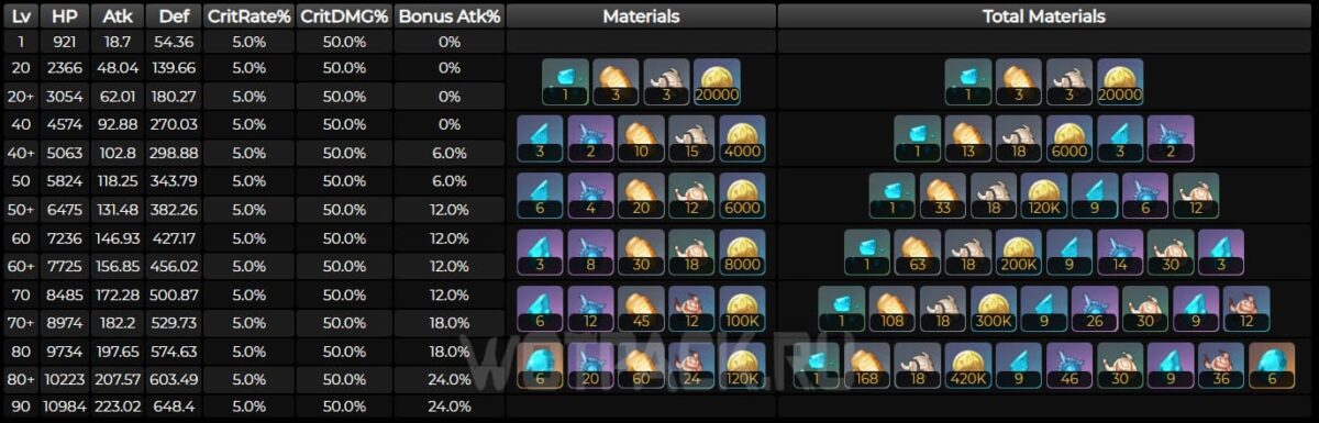 Дополнительная характеристика, которая повышается с каждым возвышением — бонус к АТК. На каждом уровне также прокачиваются базовые характеристики: HP, АТК и защита. Точные значения каждого параметра представлены в таблице ниже.