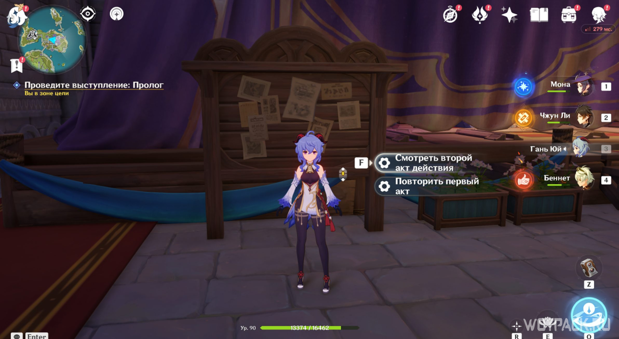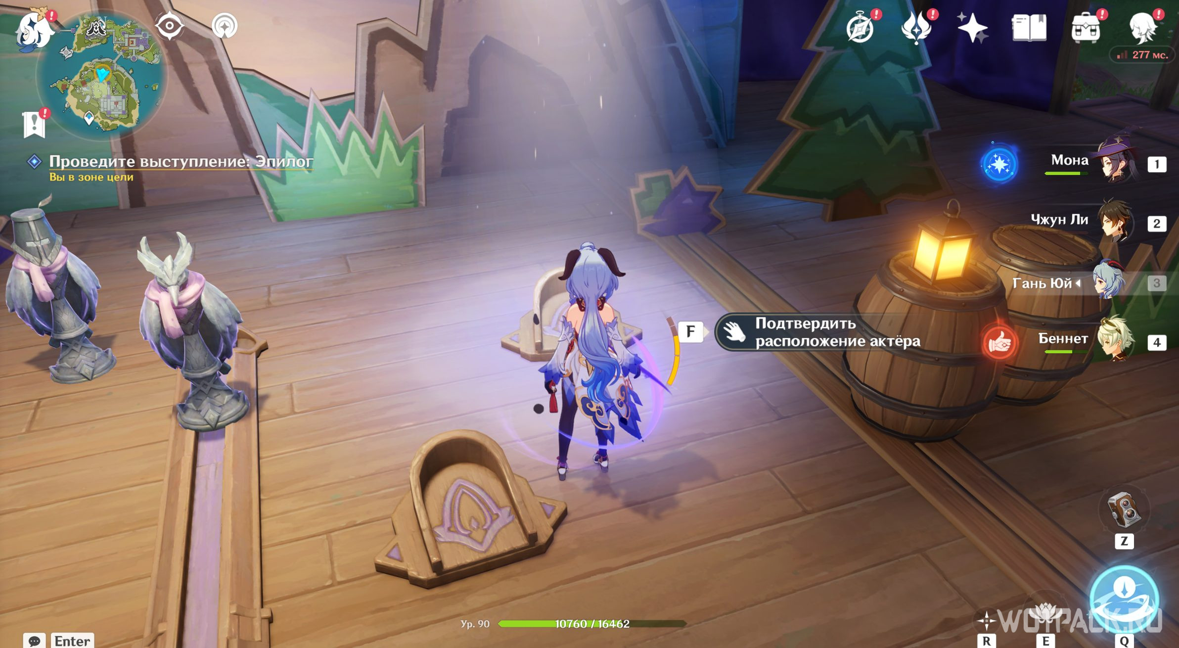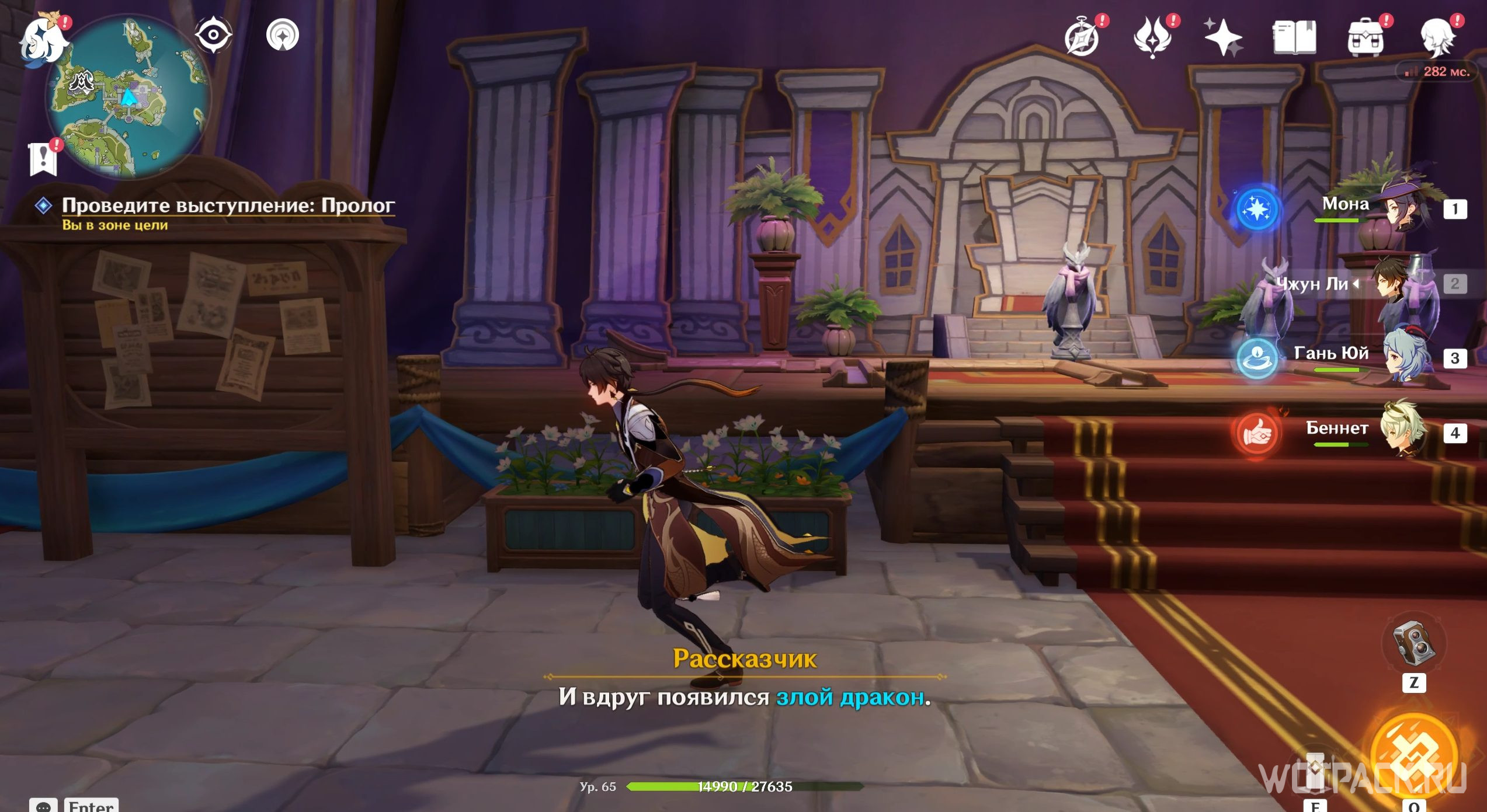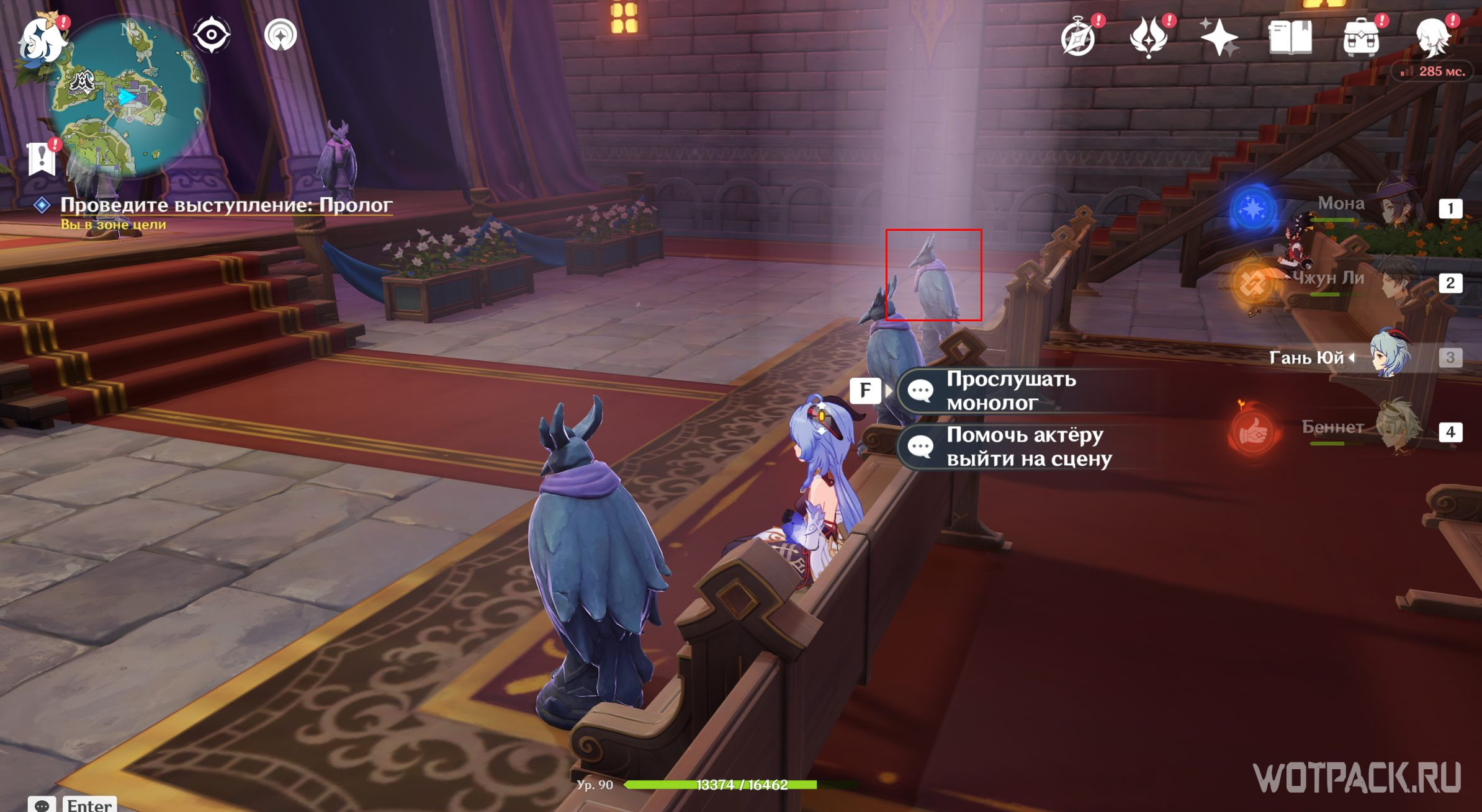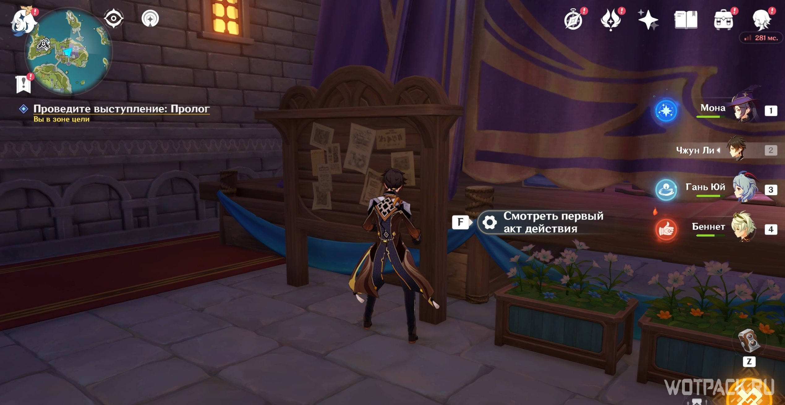 Отправляйтесь к месту, на которое светит прожектор. Подойдите туда и нажмите «Подтвердить расположение актера». Теперь можно спуститься в зрительский зал и слушать пьесу дальше. Дракон выдаст угрожающую реплику о том, что царский дворец станет охотничьим угодьем и Пролог закончится. Откройте появившийся у доски объявлений сундук и переходите ко второму акту.