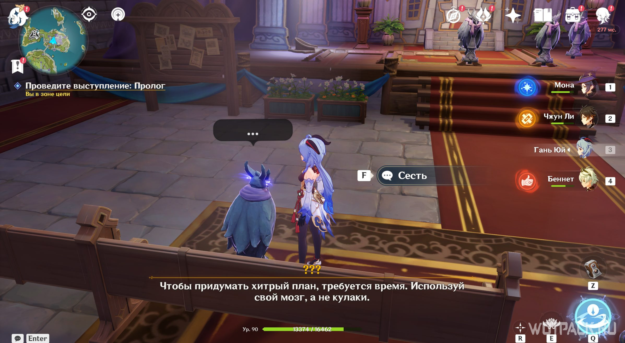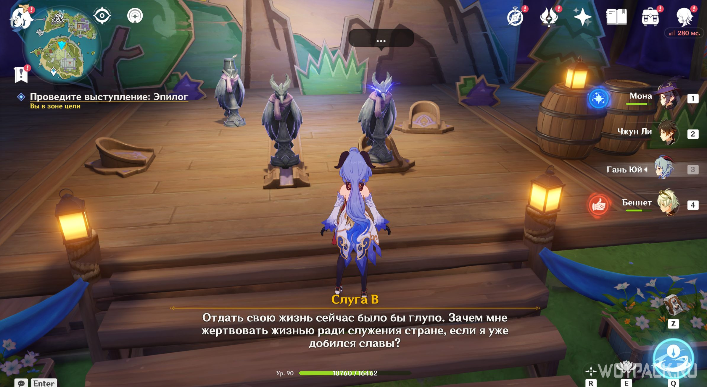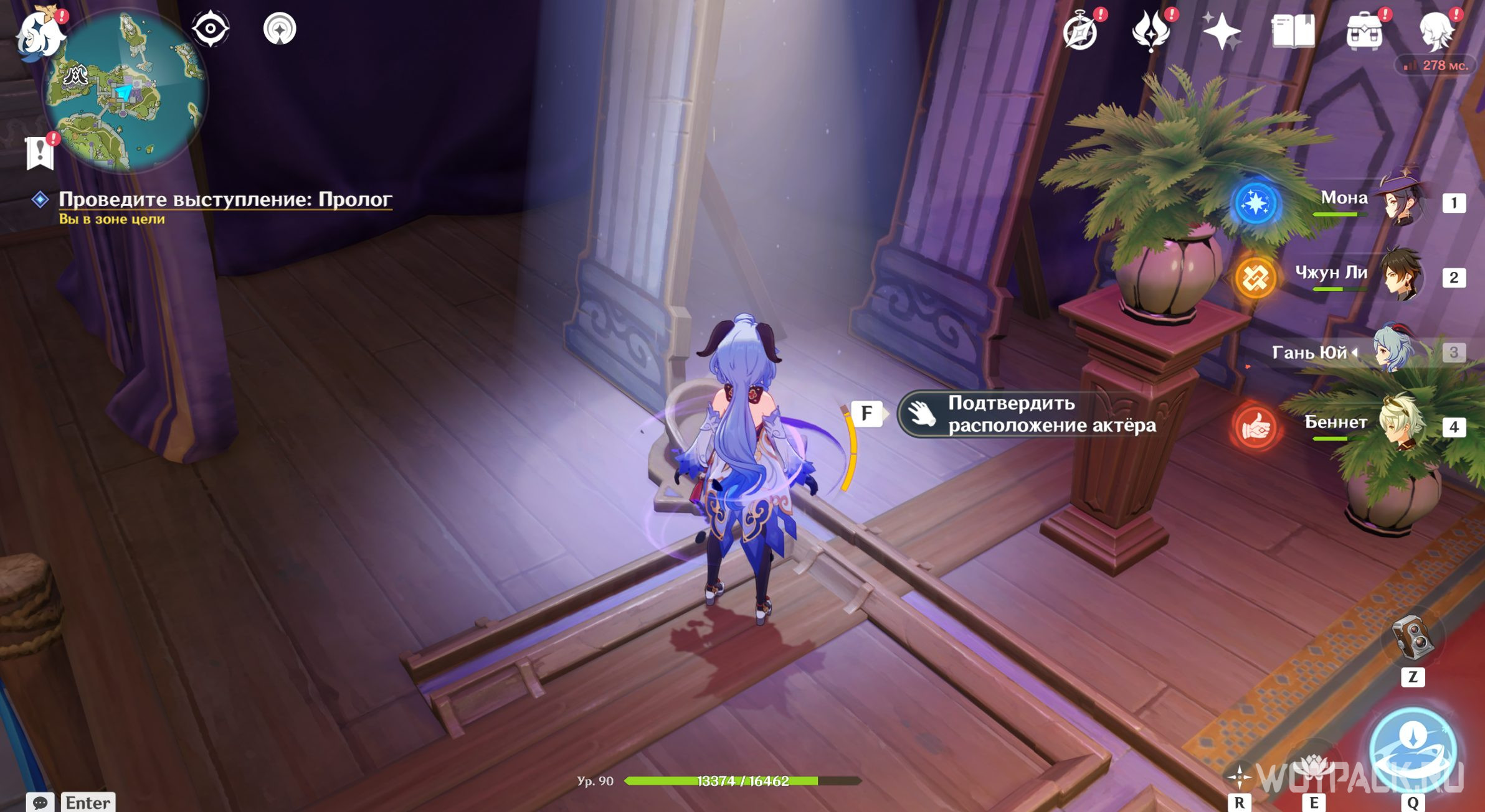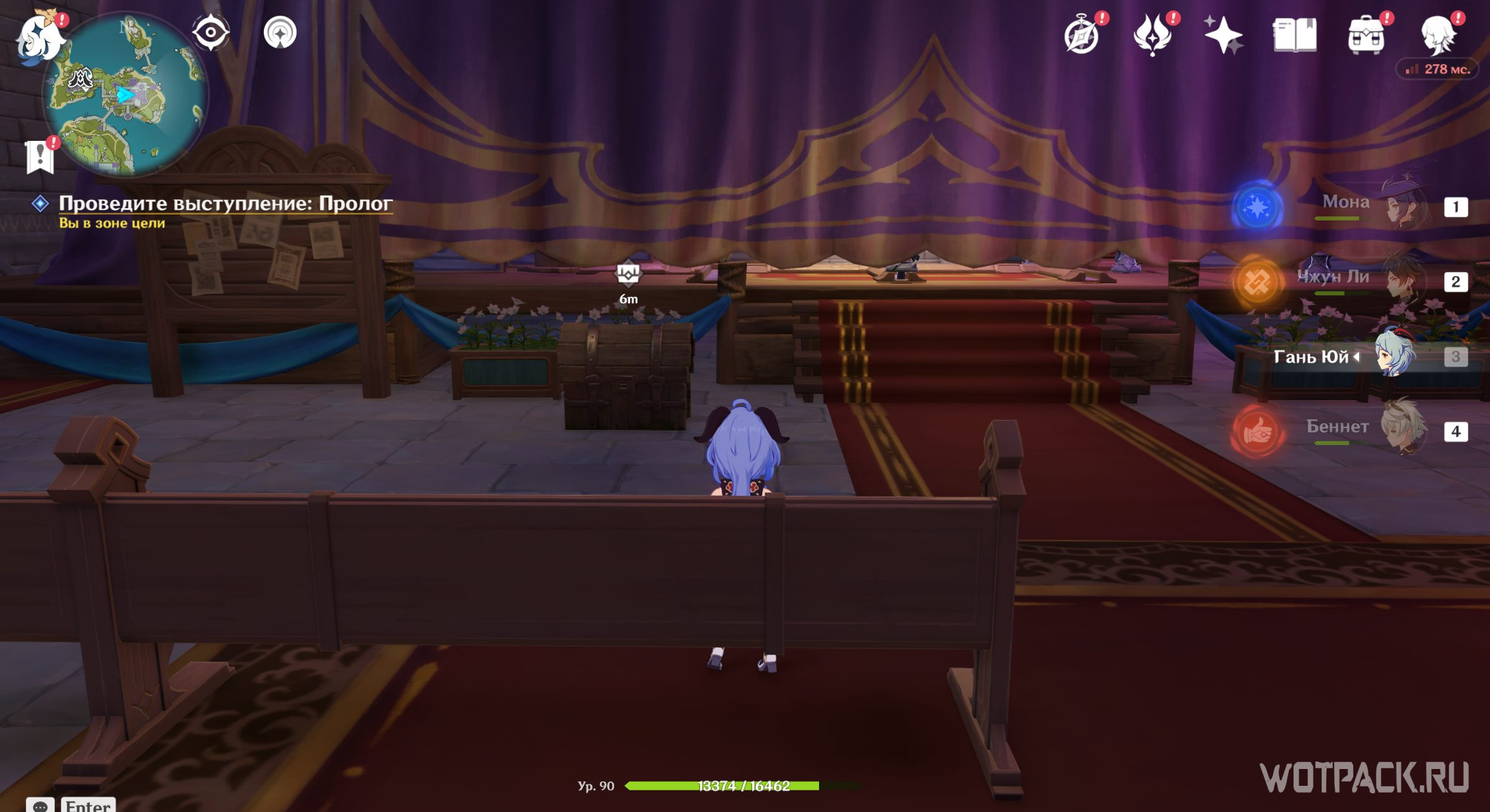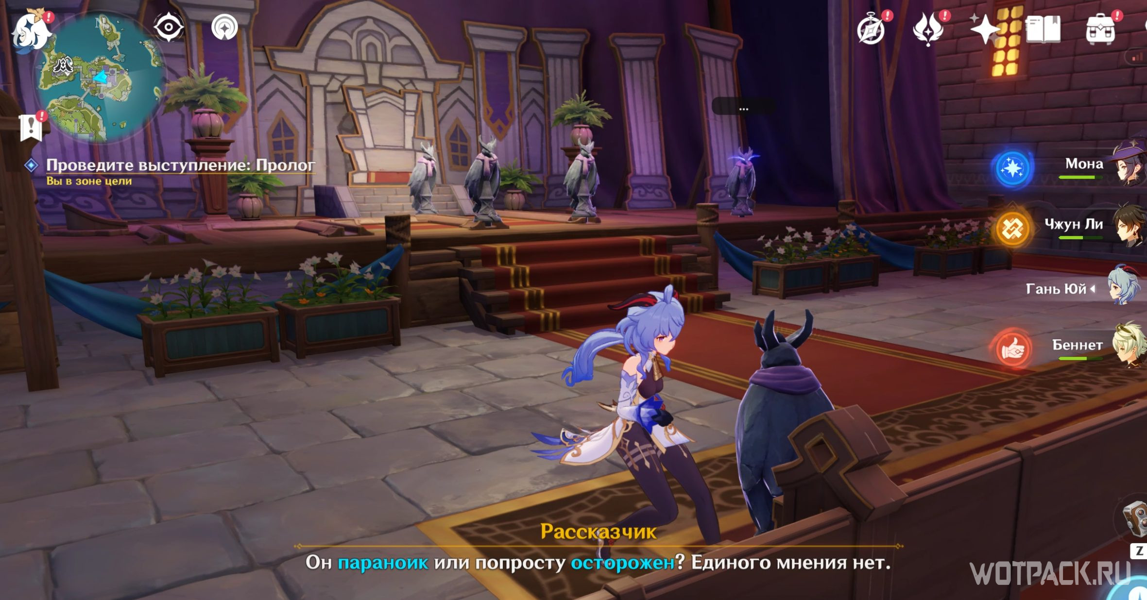 Отправляйтесь к месту, на которое светит прожектор. Подойдите туда и нажмите «Подтвердить расположение актера». Теперь можно спуститься в зрительский зал и слушать пьесу дальше. Дракон выдаст угрожающую реплику о том, что царский дворец станет охотничьим угодьем и Пролог закончится. Откройте появившийся у доски объявлений сундук и переходите ко второму акту.