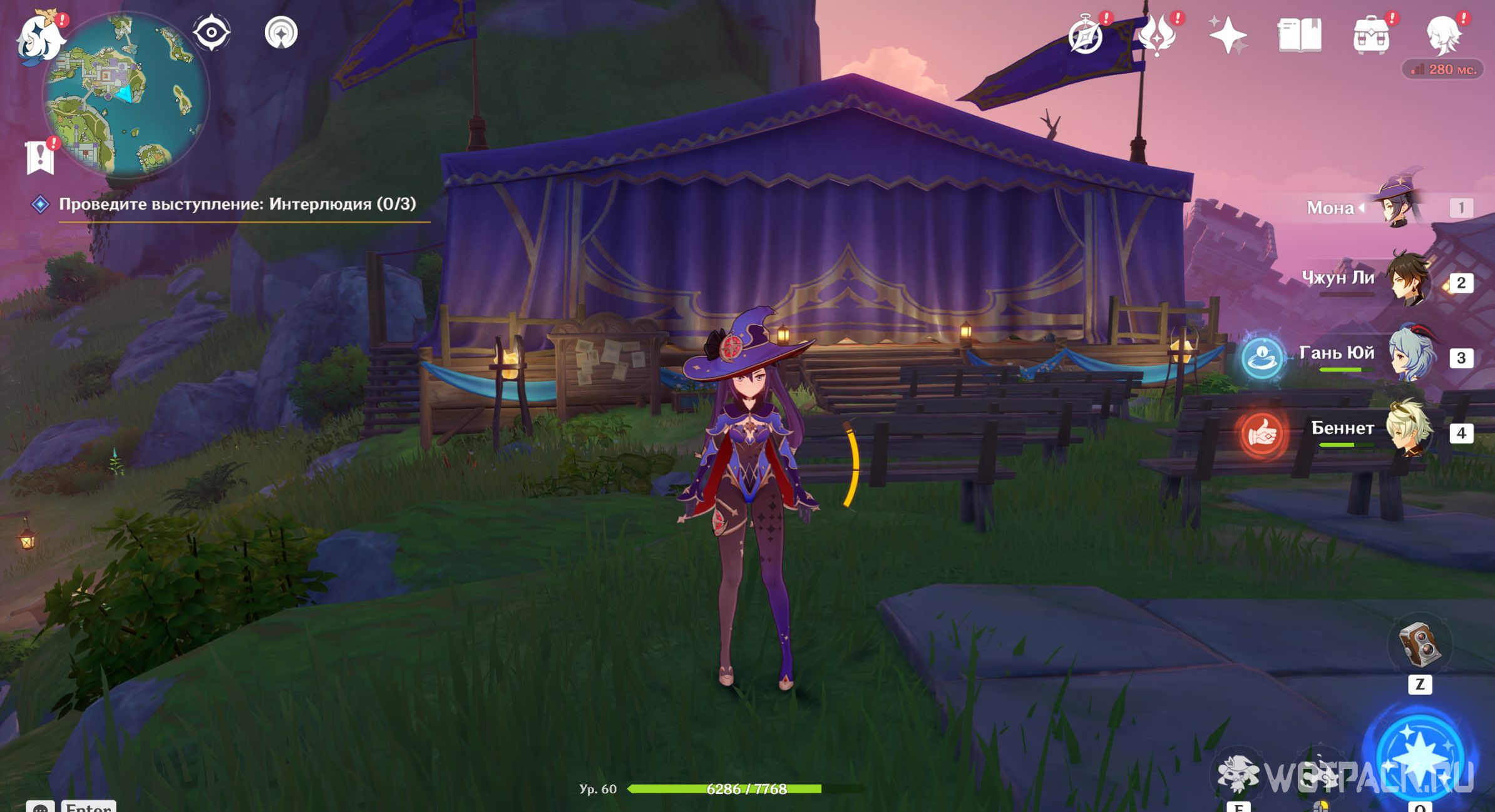 Следующая часть задания – провести выступление: Интерлюдия. Всего необходимо отыскать 3 сцены и на каждой из них устроить пьесу. Первое место расположено на юго-востоке от основного зала театра. Спуститесь вниз и отыщите шатер.