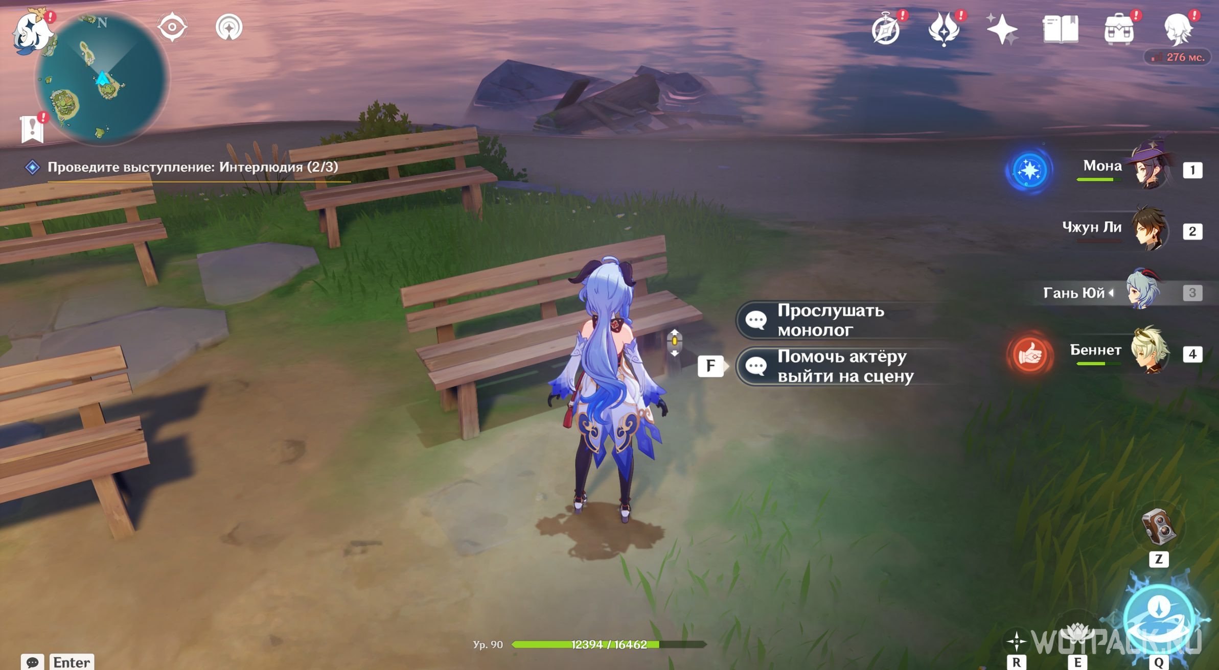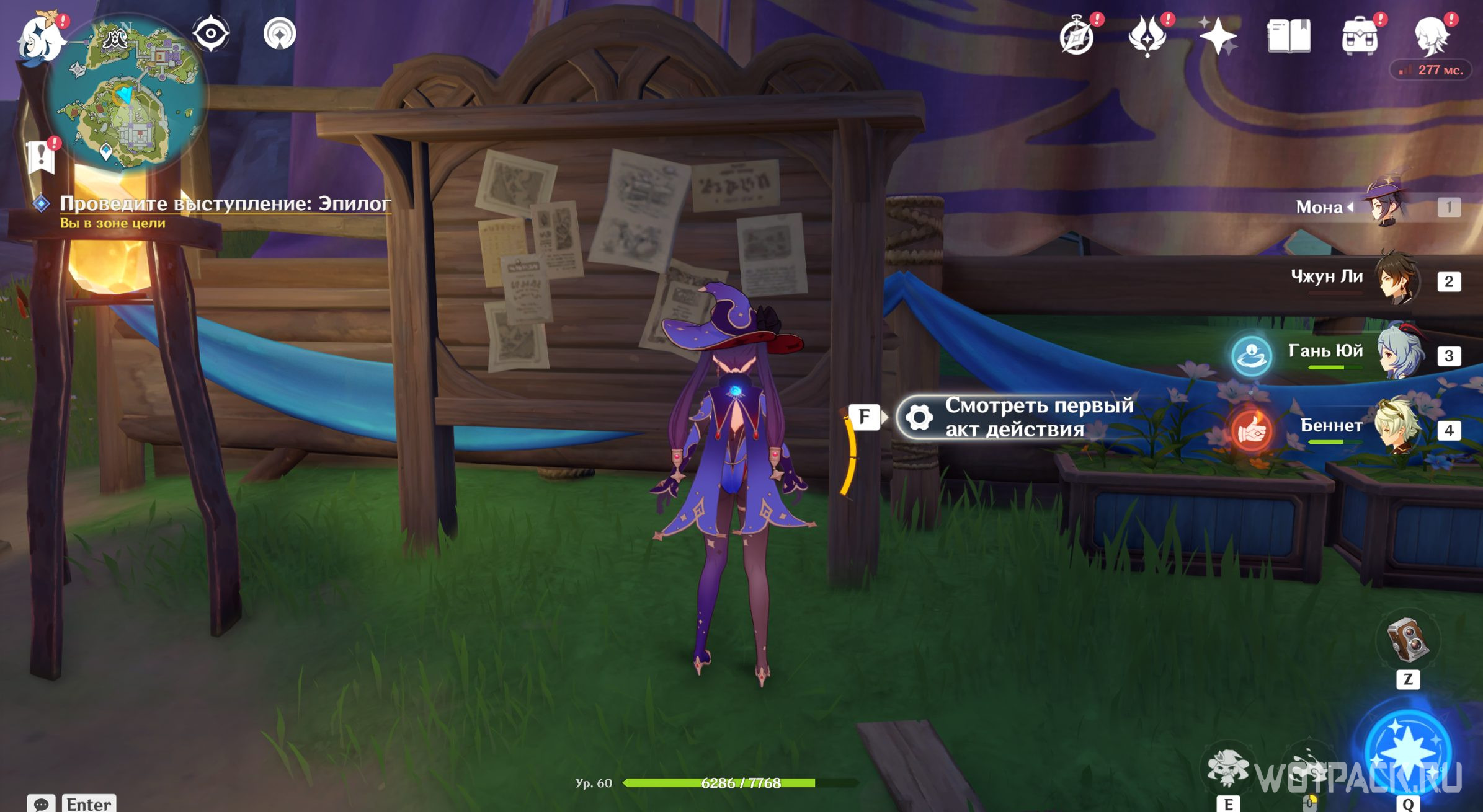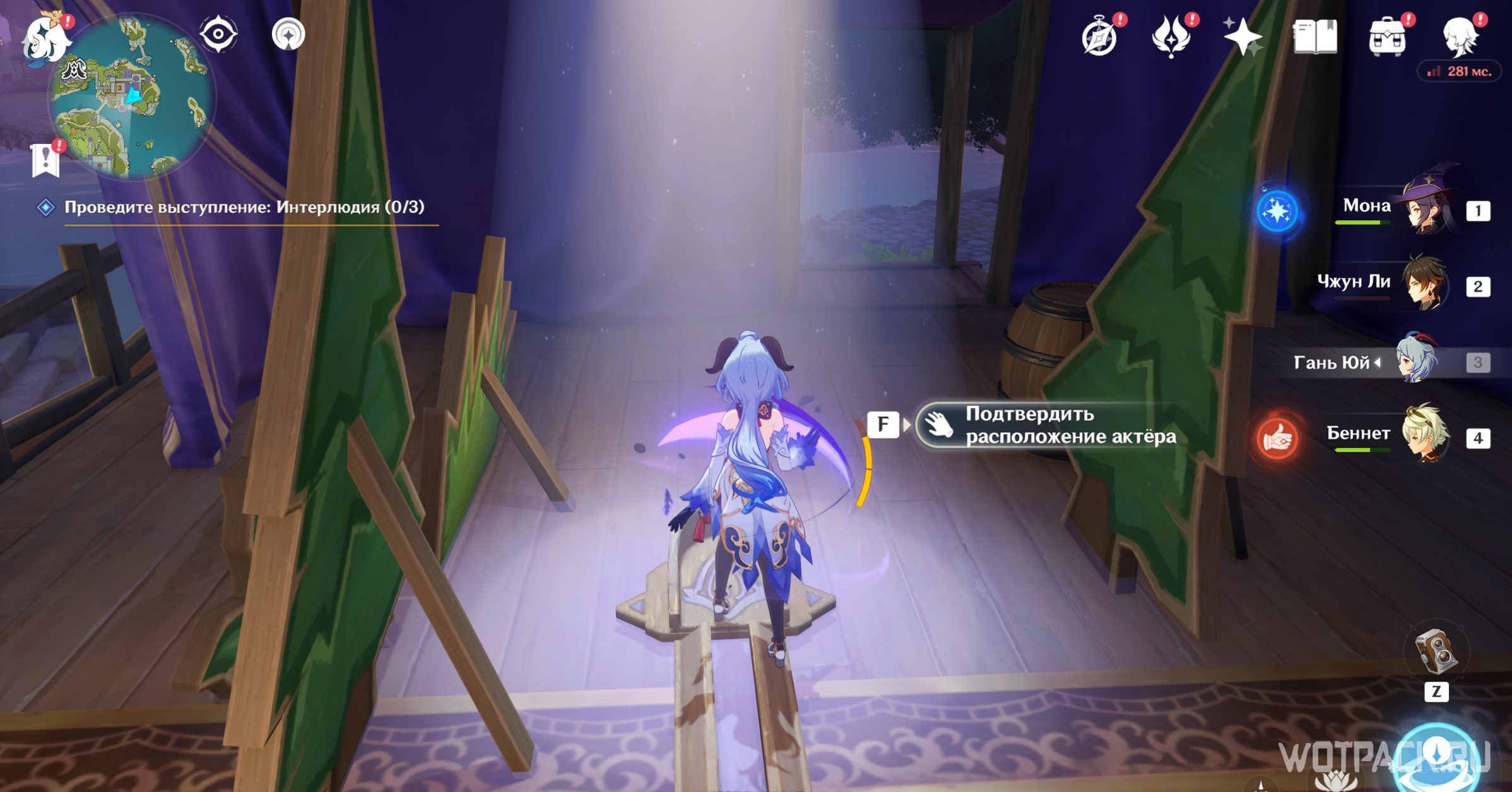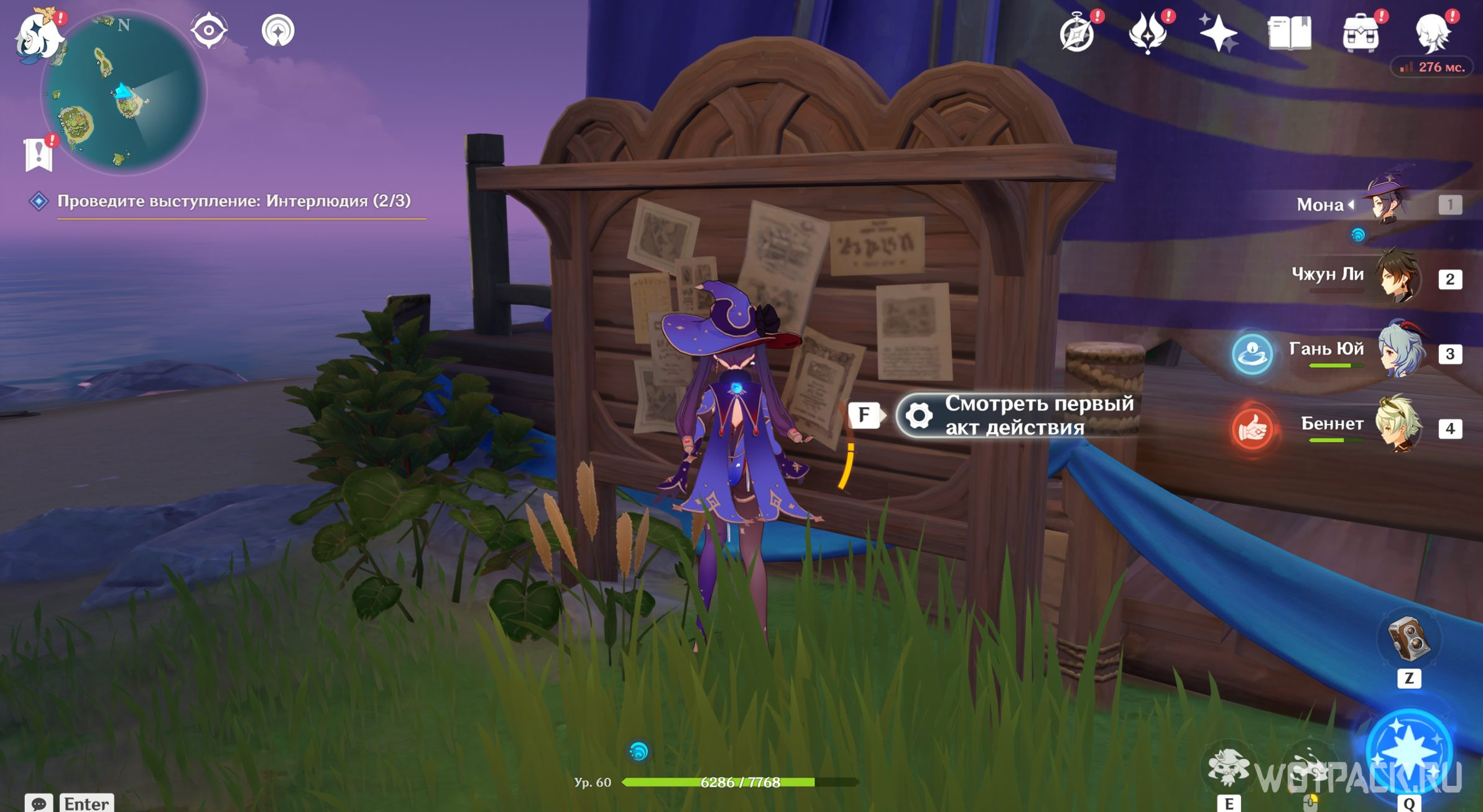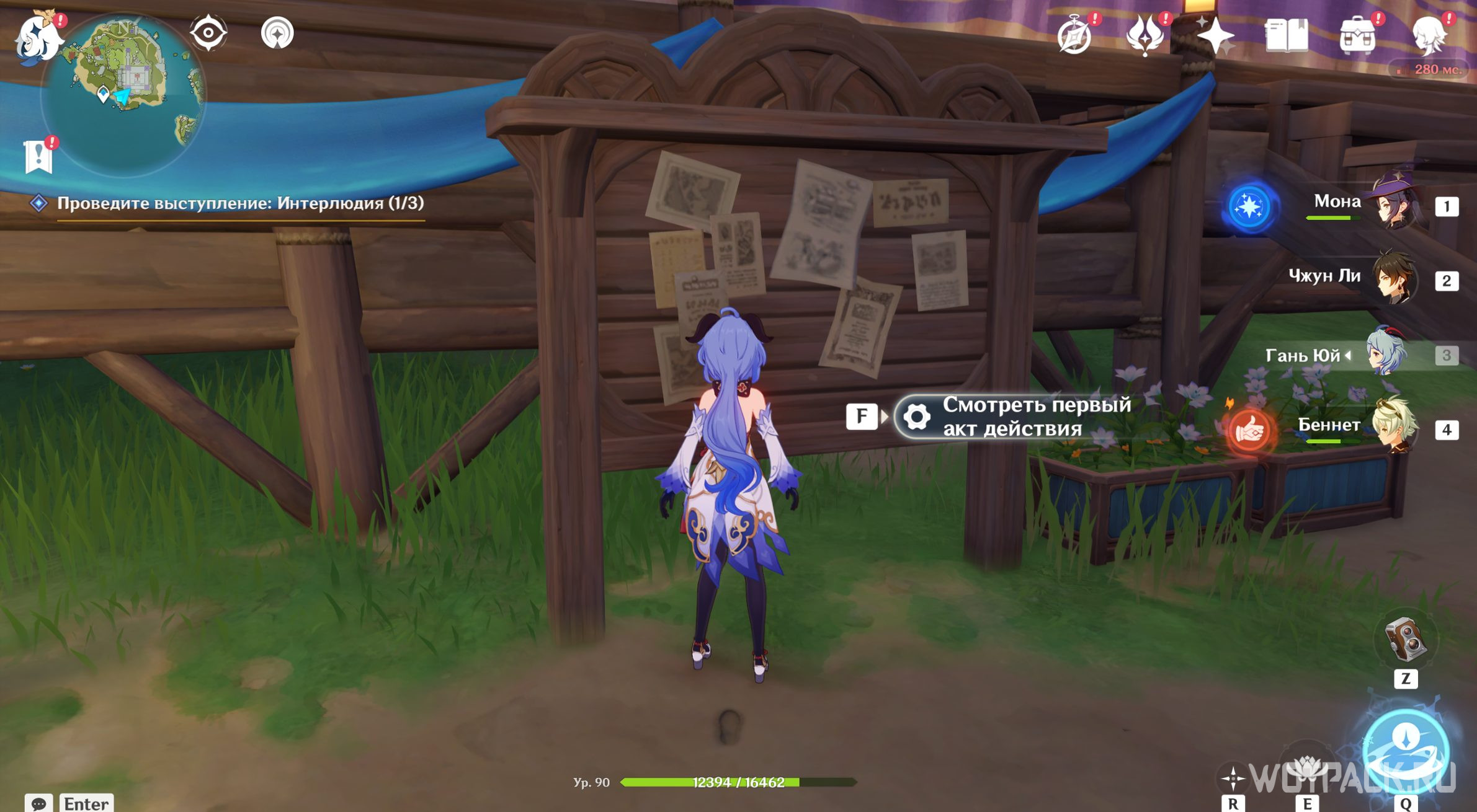 Чтобы найти театр В, отправляйтесь на самый восточный остров владений Фишль. Когда подойдете чуть ближе, обнаружите очередной шатер, к которому и нужно двигаться. Подойдите к информационной доске и нажмите «Смотреть первый акт действия».