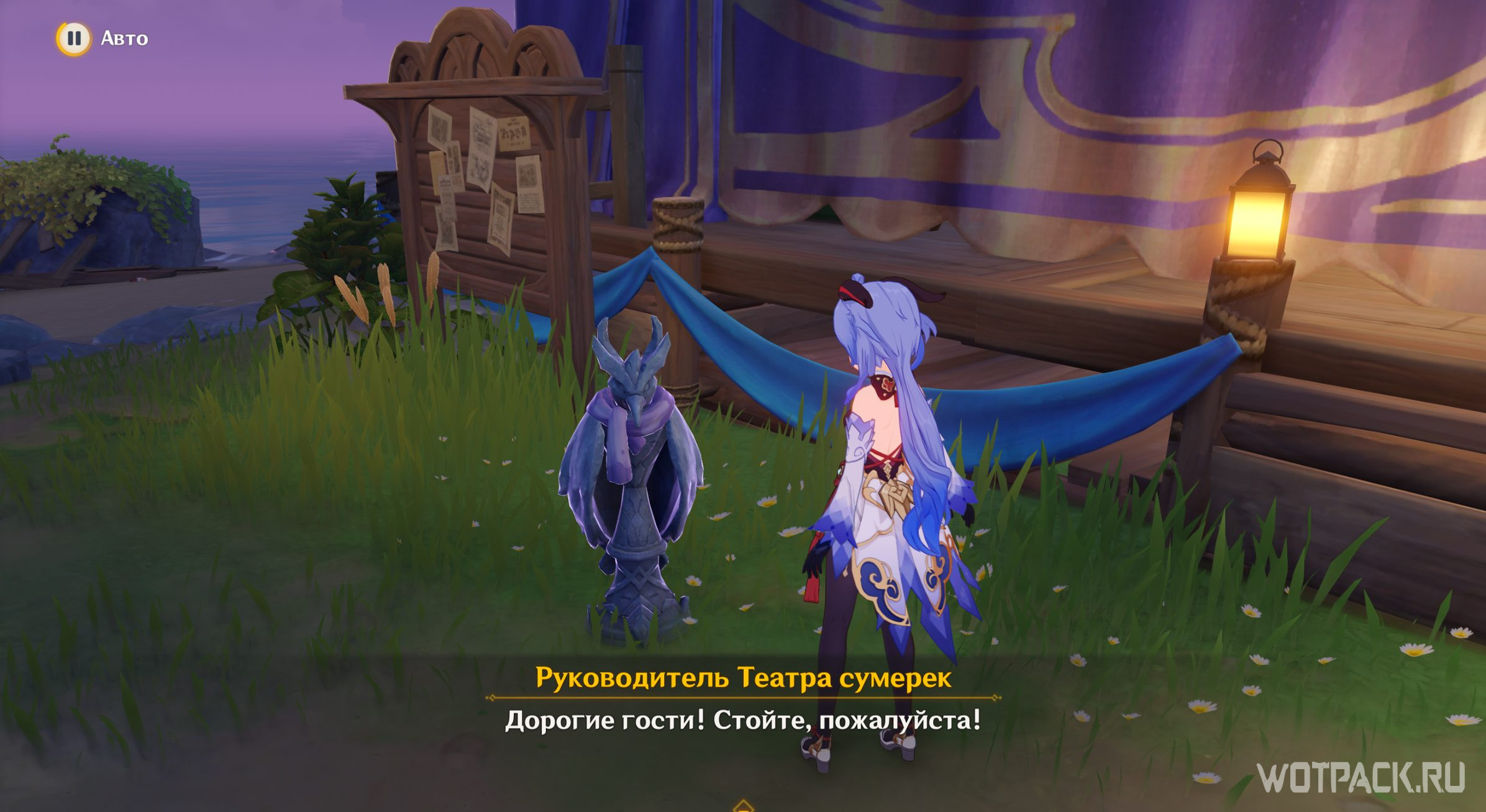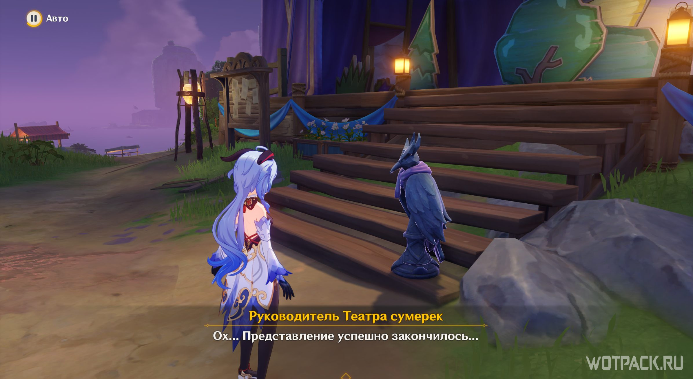 Откройте драгоценный сундук и поговорите с руководителем Театра сумерек. Он очень рад, что представление успешно закончилось и благодарит Путешественника за помощь.