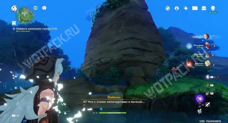 Поднявшись по большой каменной лестнице, сверните налево в узкий проход и идите вперёд, пока не увидите монстров. Победите хиличурлов и поговорите со странной статуей.