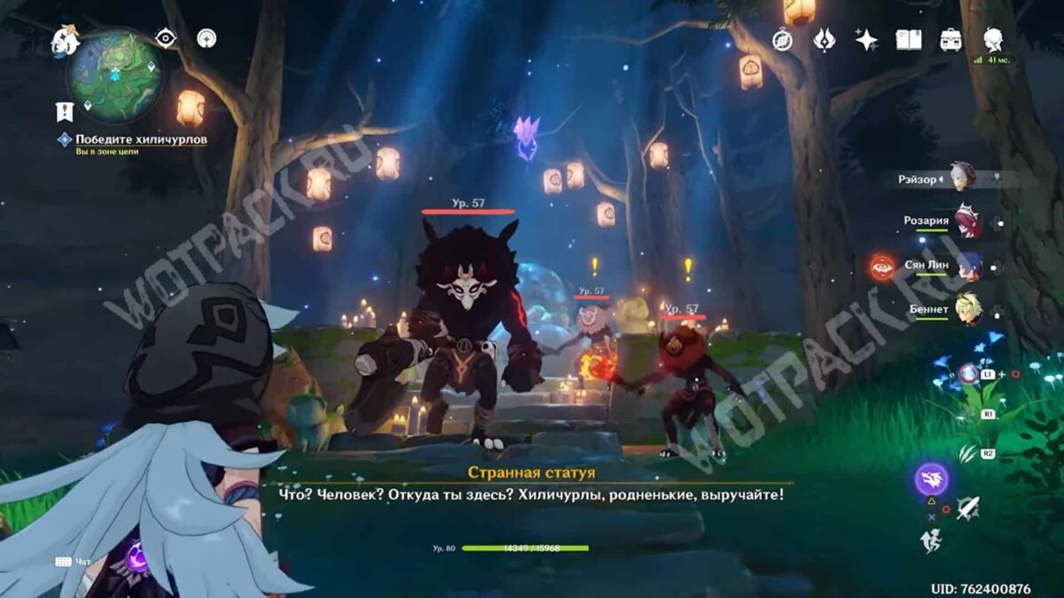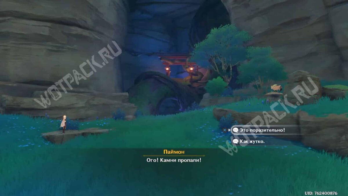Поднявшись по большой каменной лестнице, сверните налево в узкий проход и идите вперёд, пока не увидите монстров. Победите хиличурлов и поговорите со странной статуей.